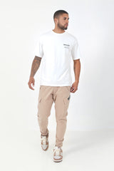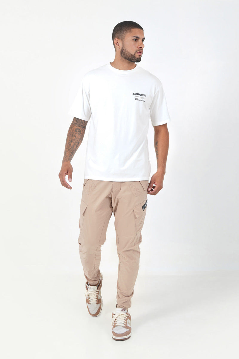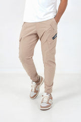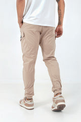 Taille élastique avec fermeture à bouton et cordon de serrage, pattes de serrage aux chevilles, fausse poche à l'arrière, matière légère et effet nylon (lisse et légèrement satinée).