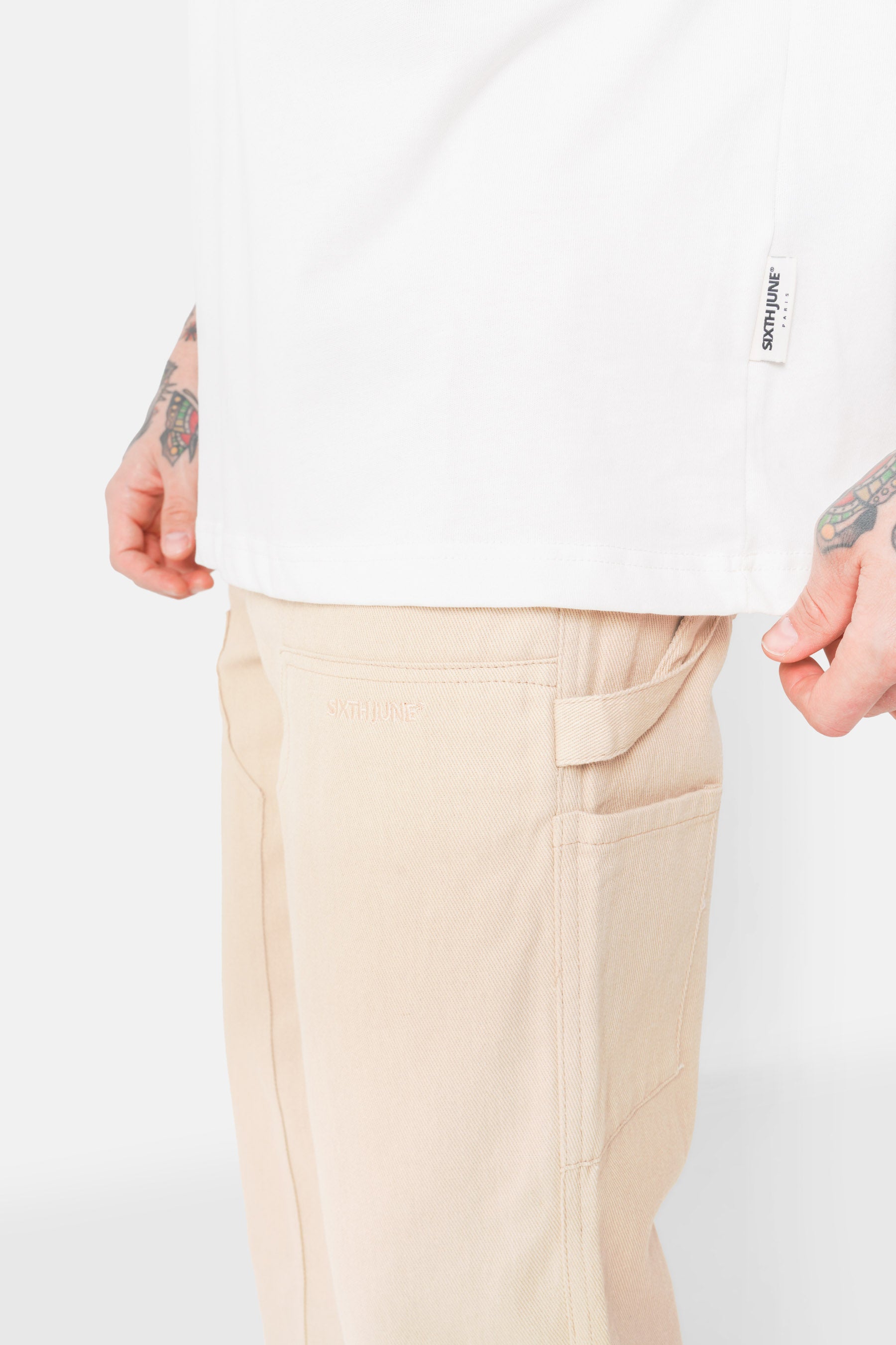 Petite broderie SIXTH JUNE sur le haut de la jambe gauche, fermeture à zip et bouton.