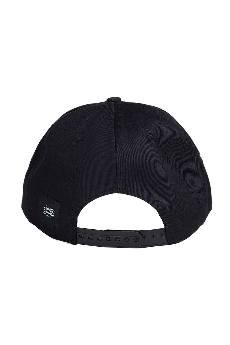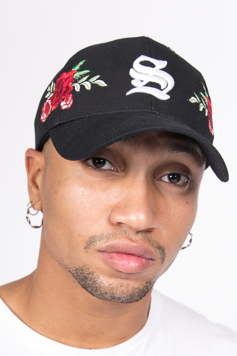 Casquette Sixth June pour homme et femme, avec des broderies : fleurs sur les côtés et SJ gothique à l'avant. Attache snapback à l'arrière et visière courbée. Modèle noir avec imprimé rouge, vert et blanc.