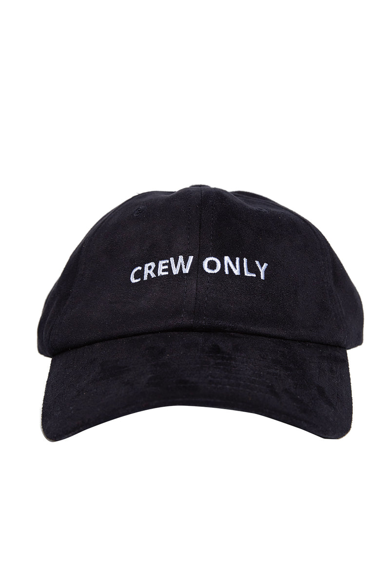 Casquette Sixth June pour homme et femme en matière suède douce et une broderie CREW ONLY à l'avant. Visière arrondie, et attache réglable "snapback" à l'arrière. Modèle noir avec broderie blanche.