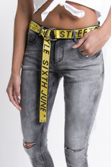 Ceinture mixte Sixth June avec inscription STREETSTYLE SIXTH JUNE et coordonnées GPS 48°51' 57" N,2° 20' 32" E. Fermeture à boucle et longueur 123 cm. Modèle jaune.