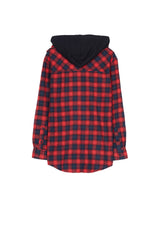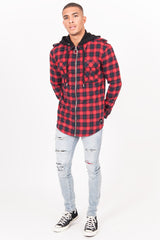 Chemise Sixth June Homme à carreaux avec une capuche intégrée. Coupe classique, fermeture zippée, poches cargo. Modèle rouge avec capuche noire.