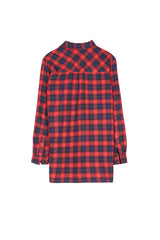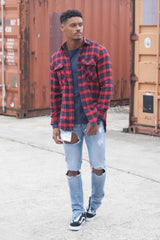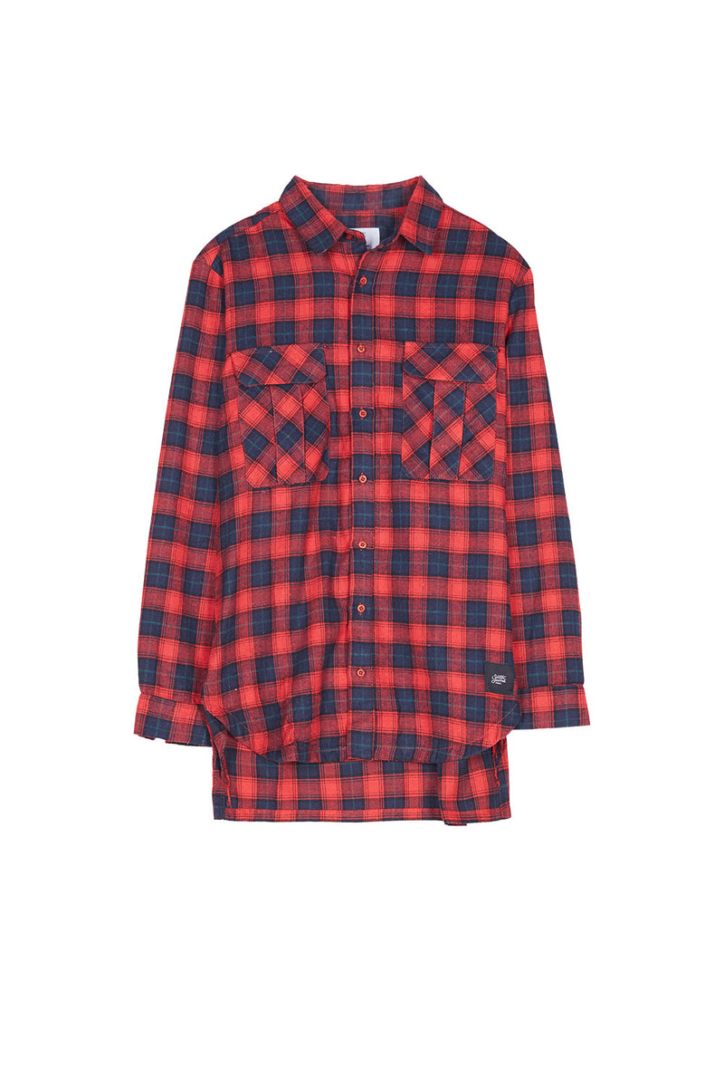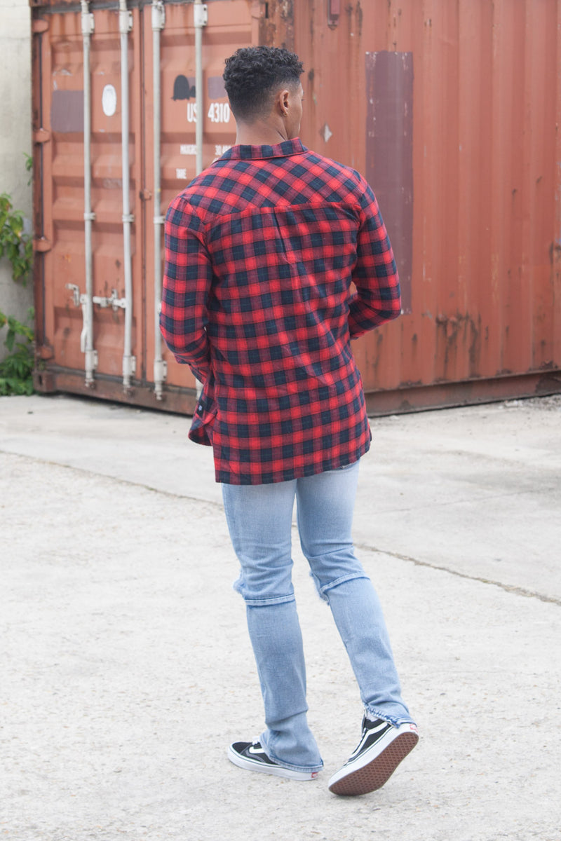 Chemise homme Sixth June à carreaux tartan en tissu fin et doux. Coupe plus longue qu'une chemise classiqe et deux grosses poches cargo au niveau de la poitrine. Modèle rouge avec des carreaux en noir et rouge et des lignes vertes.