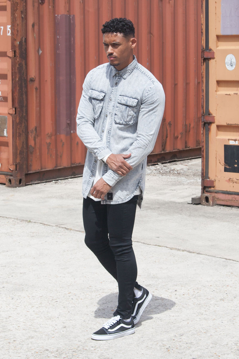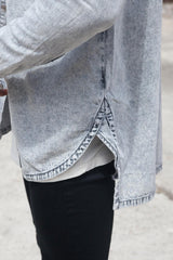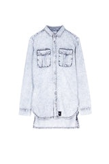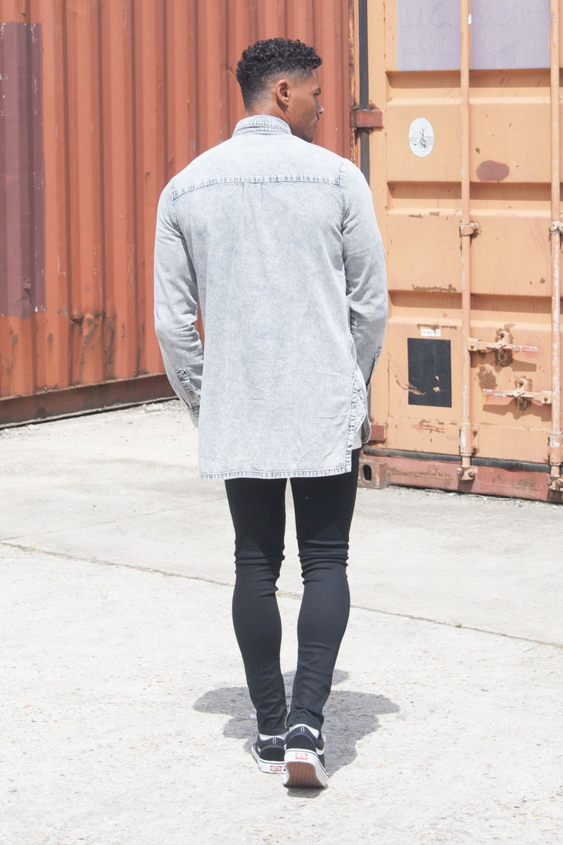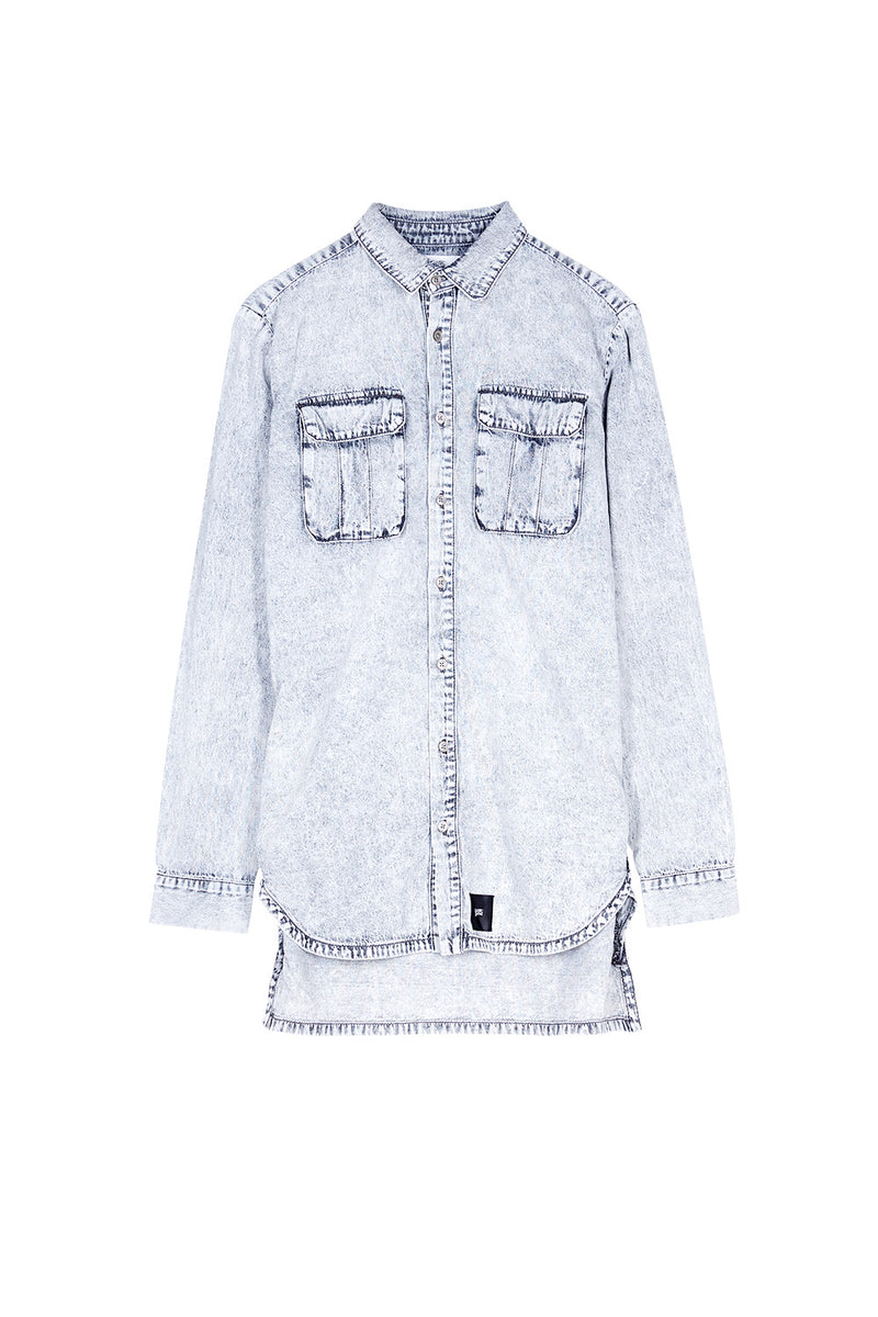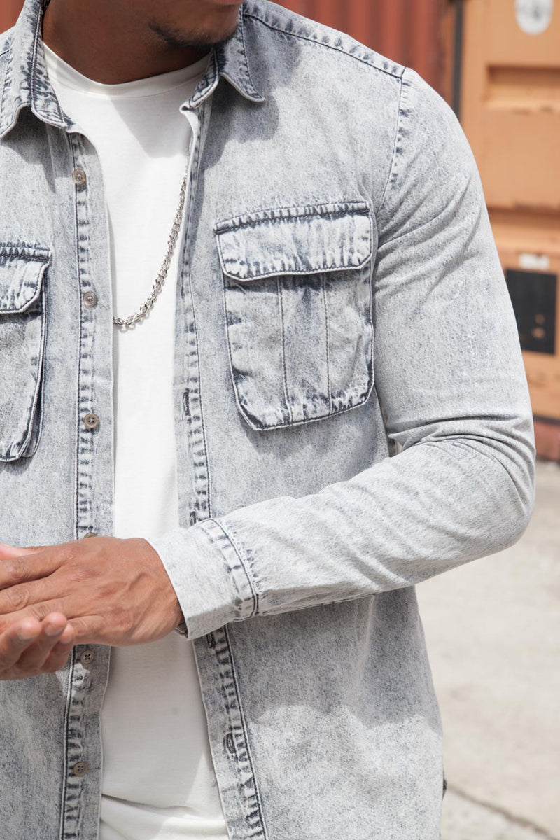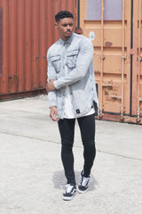 Chemise homme Sixth June avec une matière jean et deux grosses poches au niveau de la poitrine. Coupe longue en bas et classique au niveau des épaules. Modèle gris délavé.