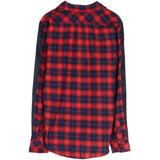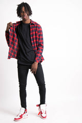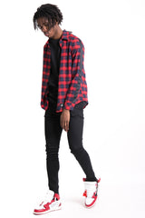 Chemise homme Sixth June avec un motif tartan et des bandes satinées le long des manches. Coupe classique et matière douce. Modèle rouge et bleu.