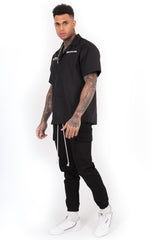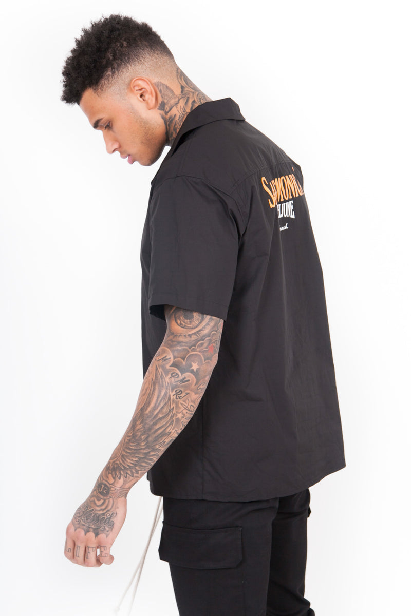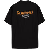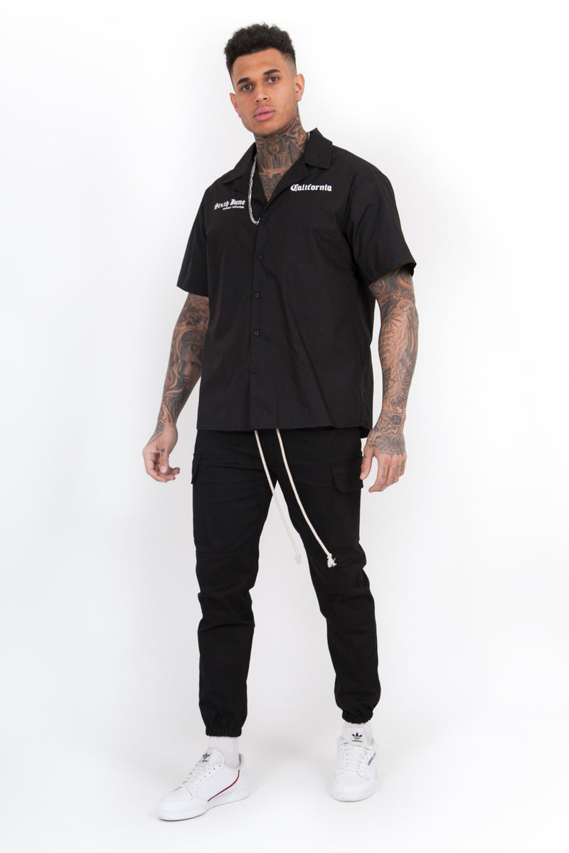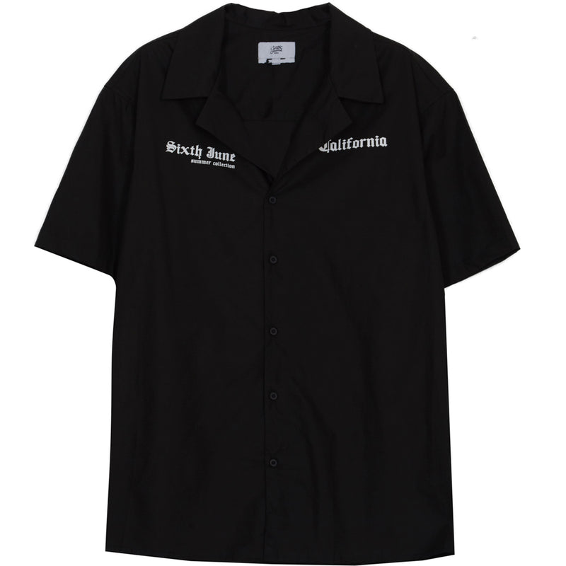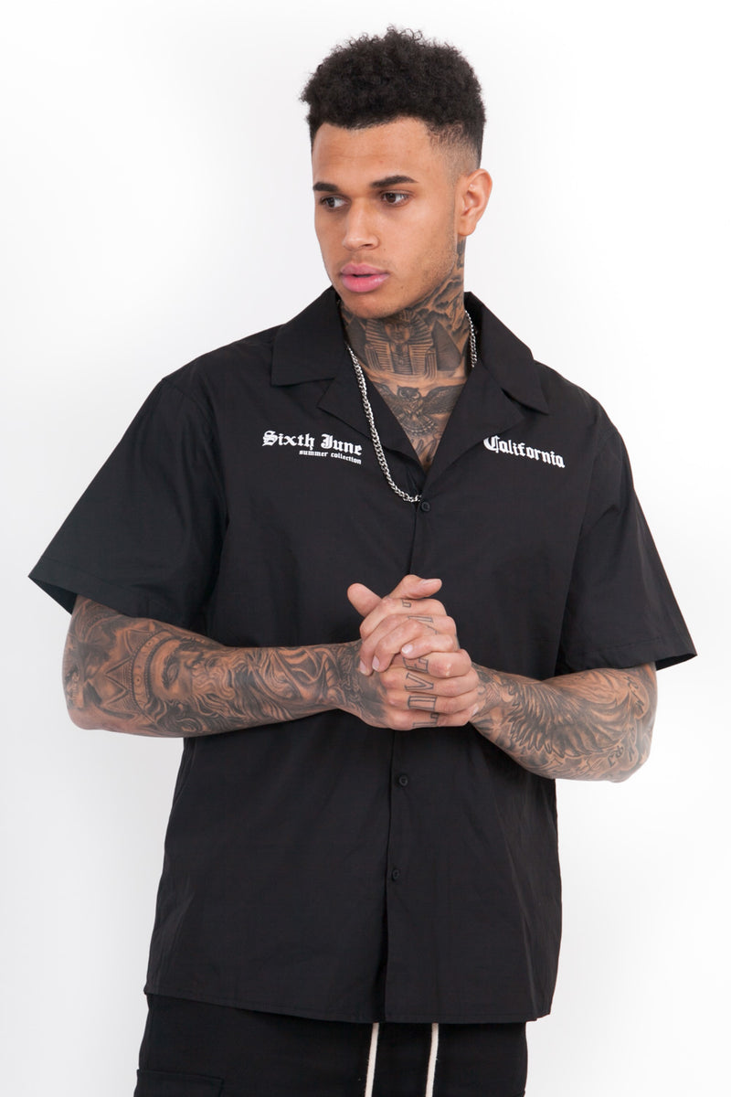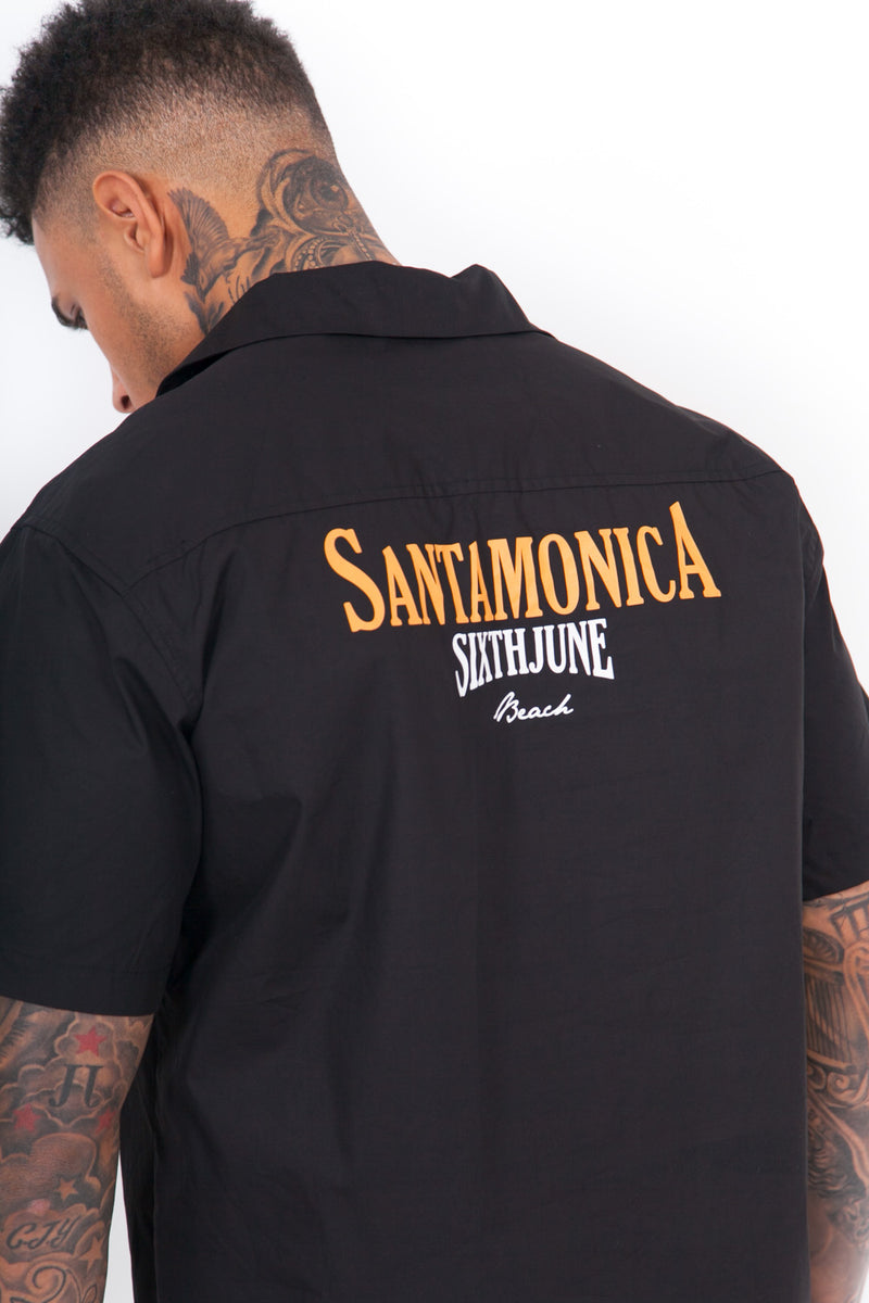 Chemisette Sixth June pour homme avec imprimés "Santa Monica" et "Sixth June beach" à l'arrière. Coupe large, fermeture boutonnée, col cassé (encolure large) et imprimés en police gothique "Sixth June", "summer collection" et "California". Modèle noir.
