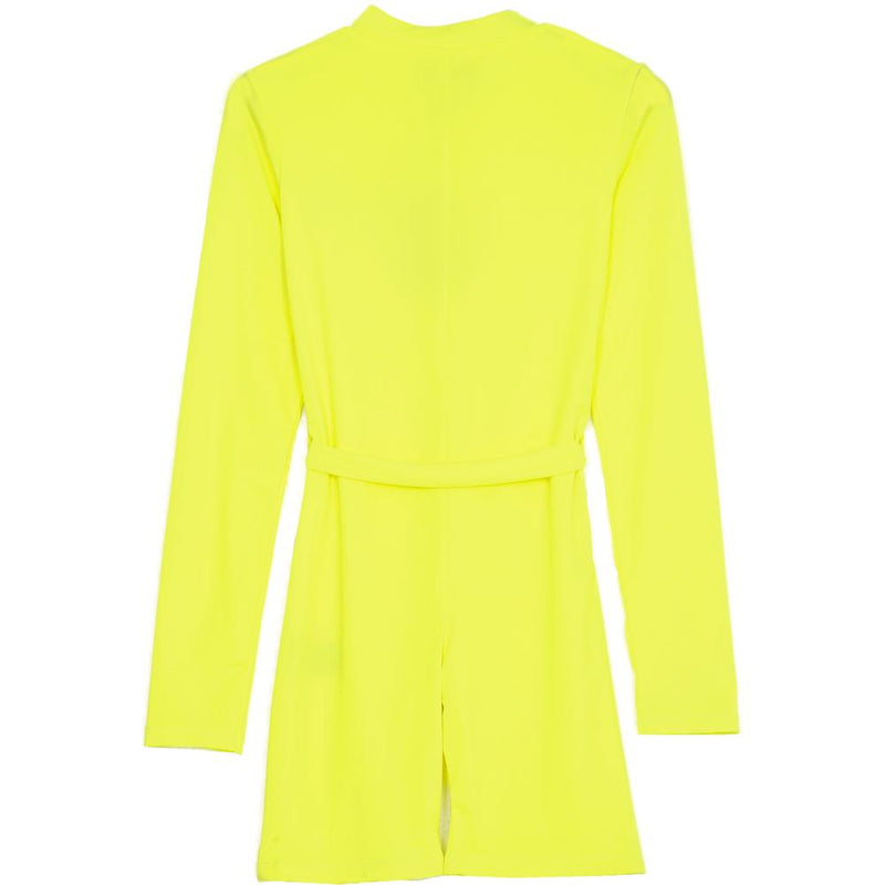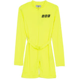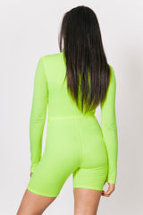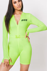 Combi-short Sixth June pour femme avec initiales "SXT" imprimé à l'avant. Coupe très moulante, longueur mini, ceinture à clip,manches avec passage pour les pouces, zip à l'avant. Modèle vert fluo.