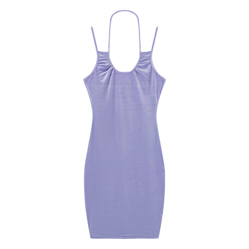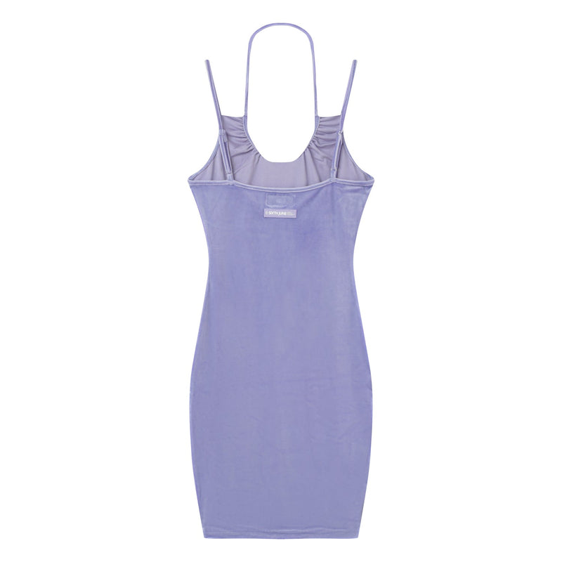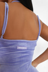 Tissu en velours côtelé, fines bretelles croisées. Tour du col froncé, bretelles réglables au dos.