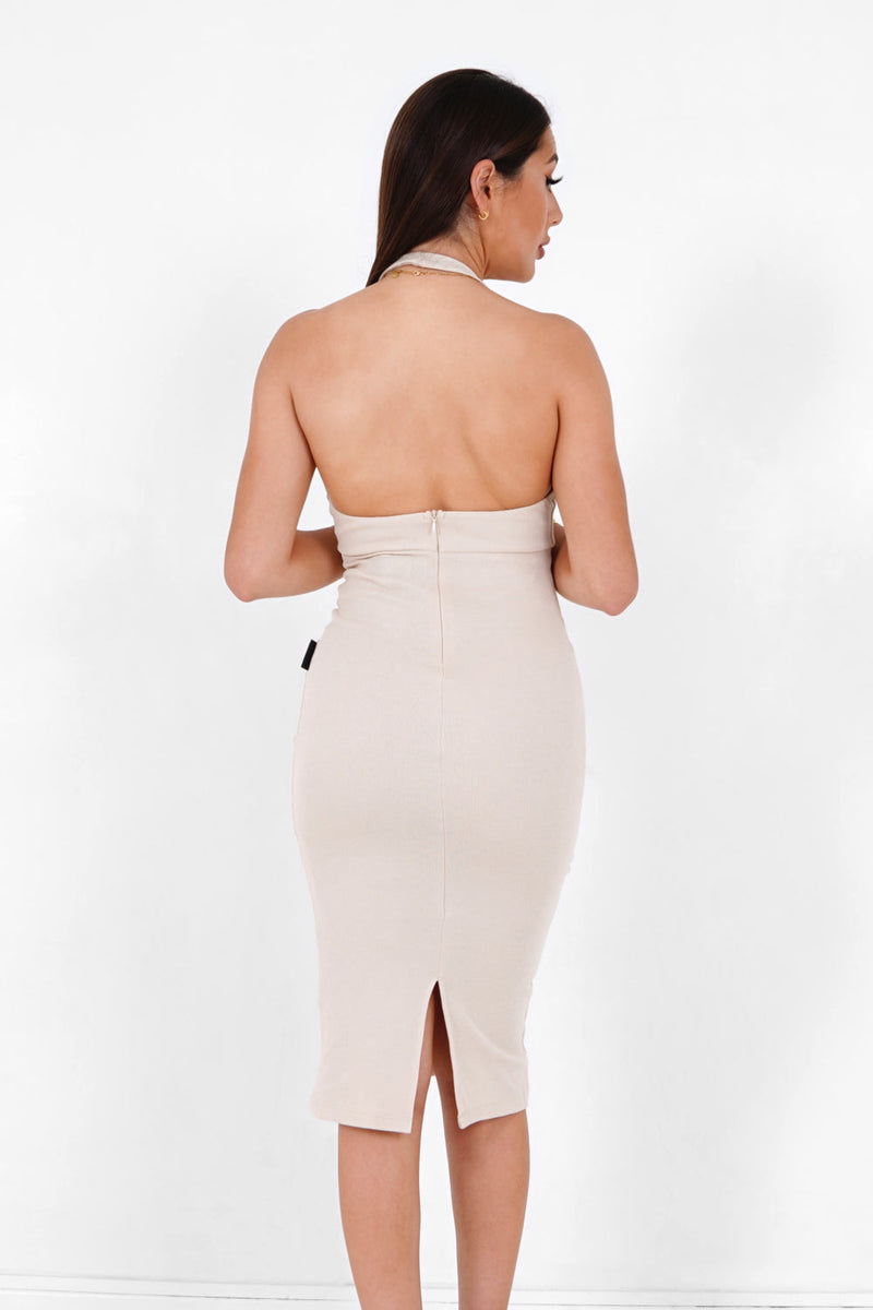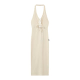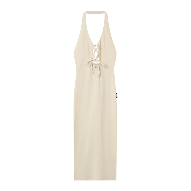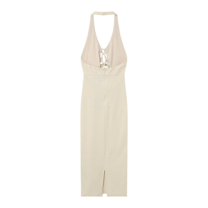 Décolleté ouvert avec cordons de serrage, fermeture à zip et fente à l'arrière.