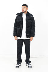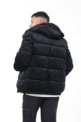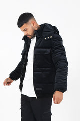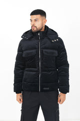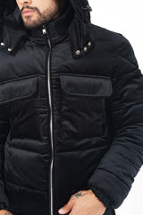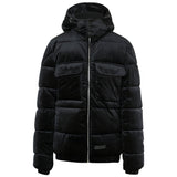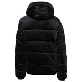 Effet matelassée avec tissu côtelé en velours, capuche amovible avec cordon de serrage et fermeture à bouton pression. Deux poches à rabat à l'avant, deux poches latérales avec fermeture à zip, poche intérieur, logo sur patch en caoutchouc à la base, élastique aux poignets et à la taille.