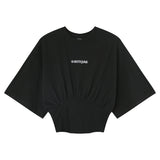 T-shirt à manches courtes pour femme de marque Sixth June. Effet corset à la taille, logo brodé au niveau de la poitrine. Taille élastique au dos, col rond et côtelé. Coupe ajustée, courte. Modèle noir.