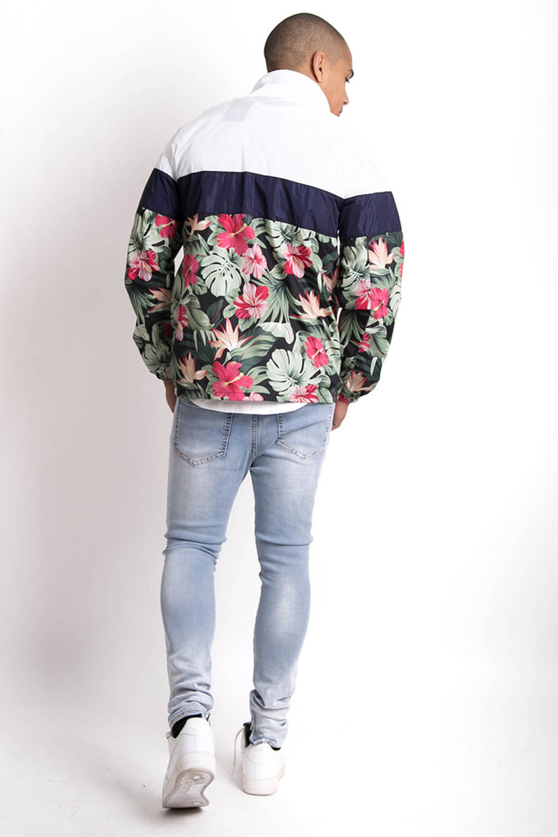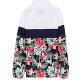 Coupe-vent homme Sixth June avec un imprimé tropical all over et une bande imprimée SIXTH JUNE. Coupe classique, scratch au niveau du col et poches kangourou. Modèle blanc et vert.