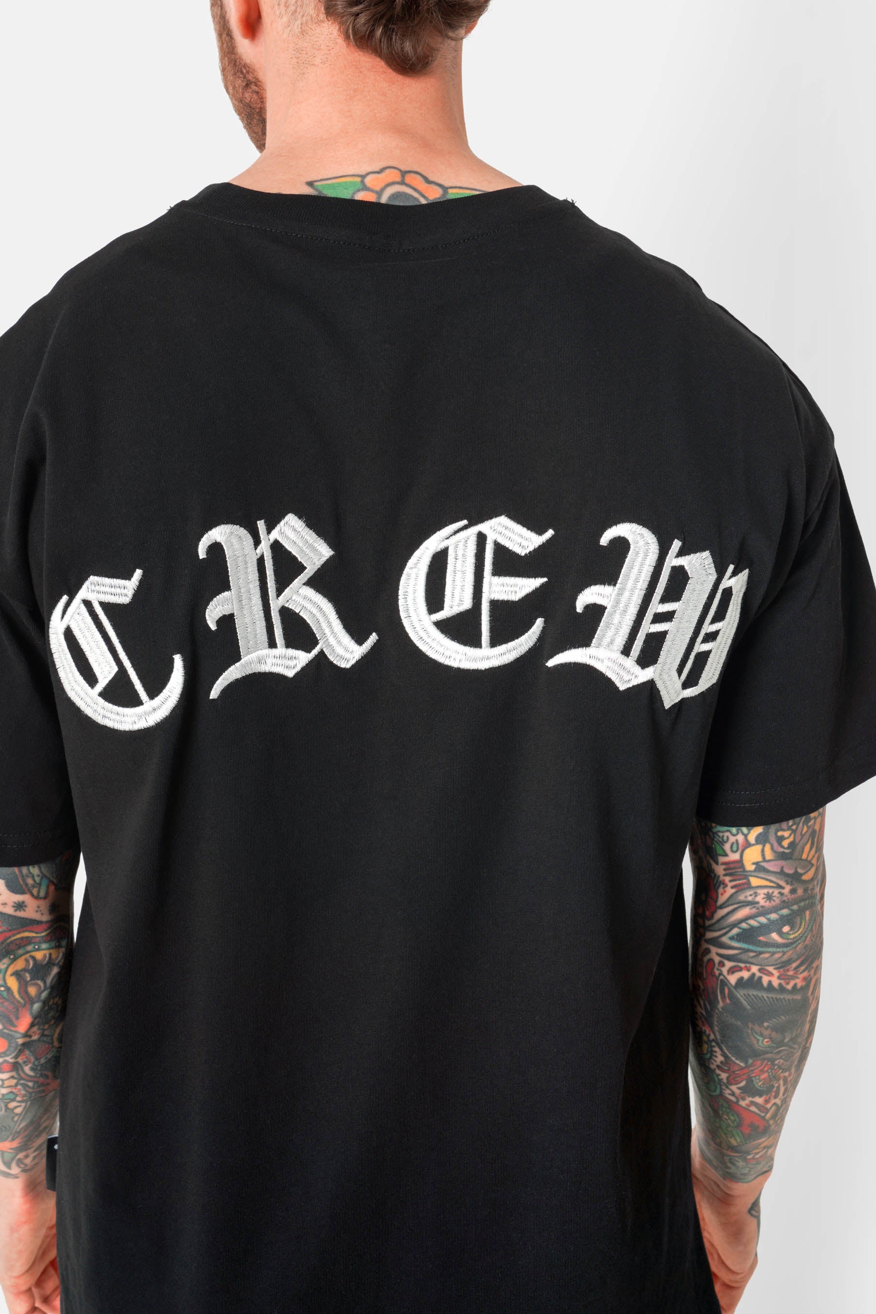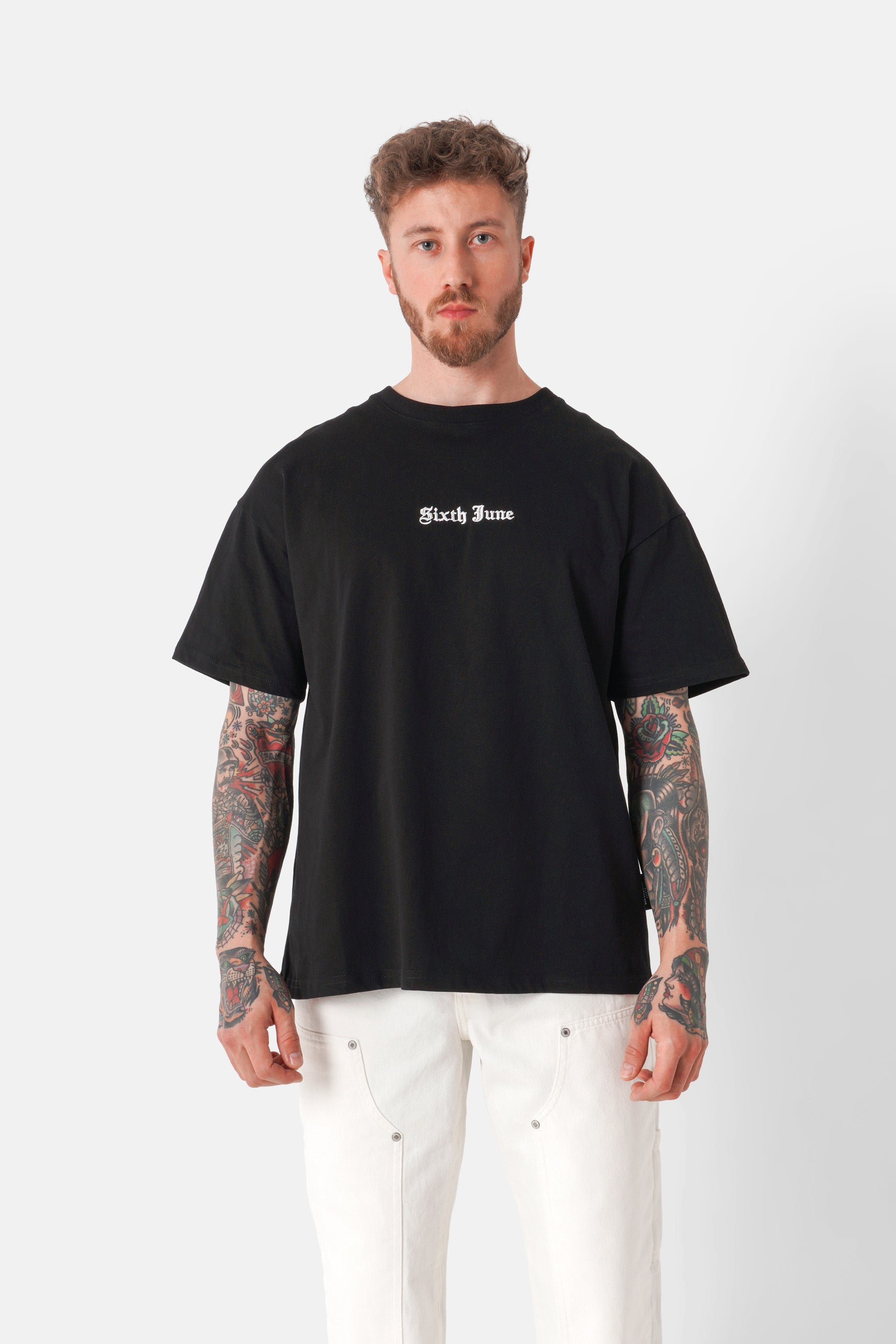 Broderies dans un style gothique à l'avant: SIXTH JUNE et à l'arrière: crew.