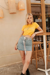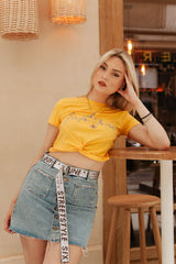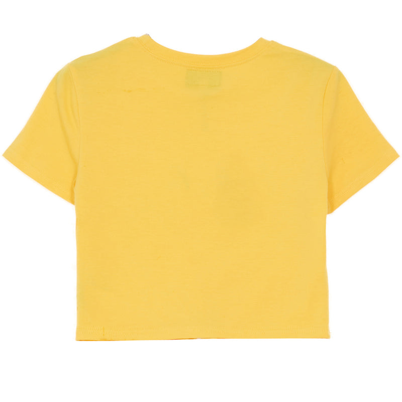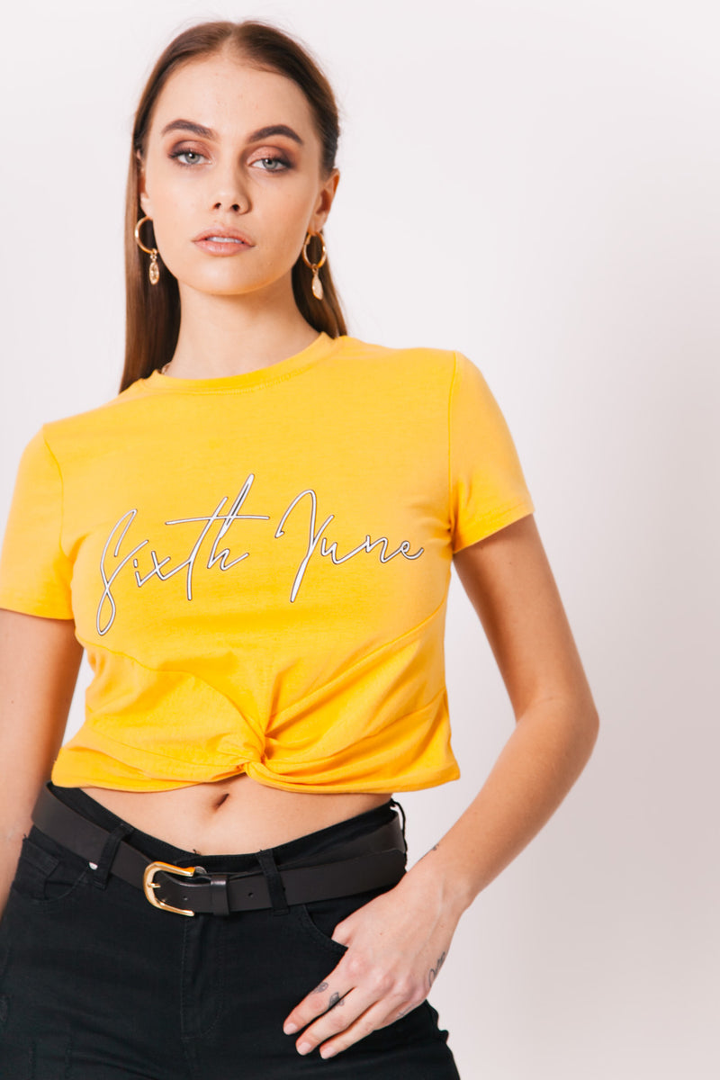 T-Shirt court Sixth June pour femme avec logo signature imprimé à l'avant. Coupe classique et très courte (façon crop top) et détail faux noeud à l'avant. Modèle jaune.