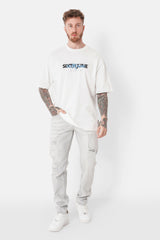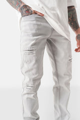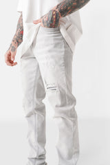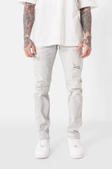 Patch en jeans gris foncé au niveau des cuisses et du genou droit avec un effet usé, déchiré.