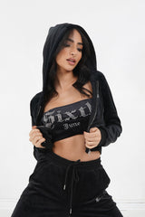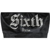 Matière très douce, effet velours, inscription Sixth June en strass et caractère gothique à l'avant.