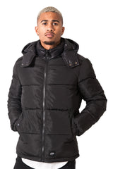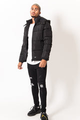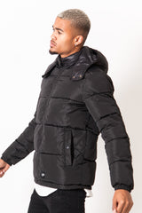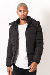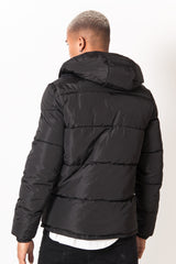 Doudoune à capuche pour homme de marque Sixth June. Effet brillant au niveau du col et de l'intérieur de la capuche. Capuche amovible, 2 poches latérales, un poche intérieure, fermeture zippée. Coupe classique. Modèle noir.