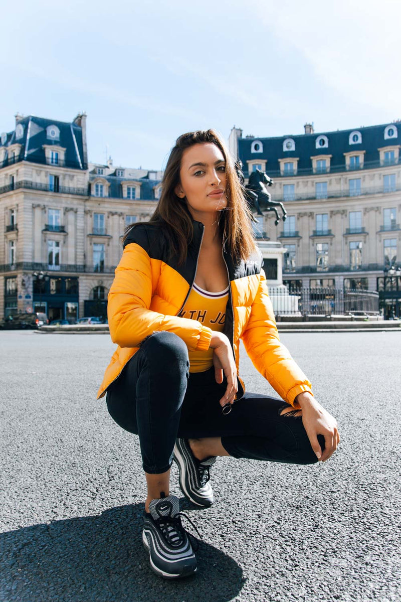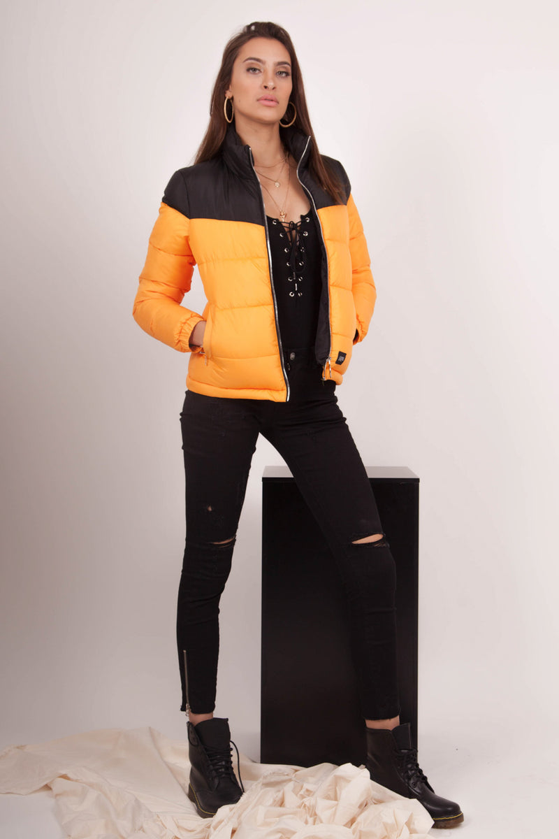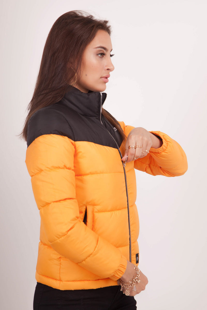 Doudoune bicolore Sixth June pour femme en matière fine et légère. Coupe classique, fermeture zippée, poche intérieure, poches latérales zippées, col montant et "Sixth June Paris" imprimé à l'avant. Modèle jaune et noir.