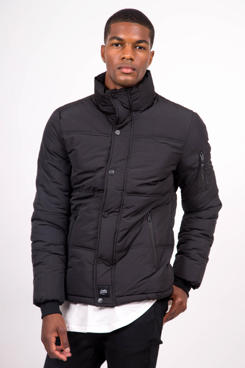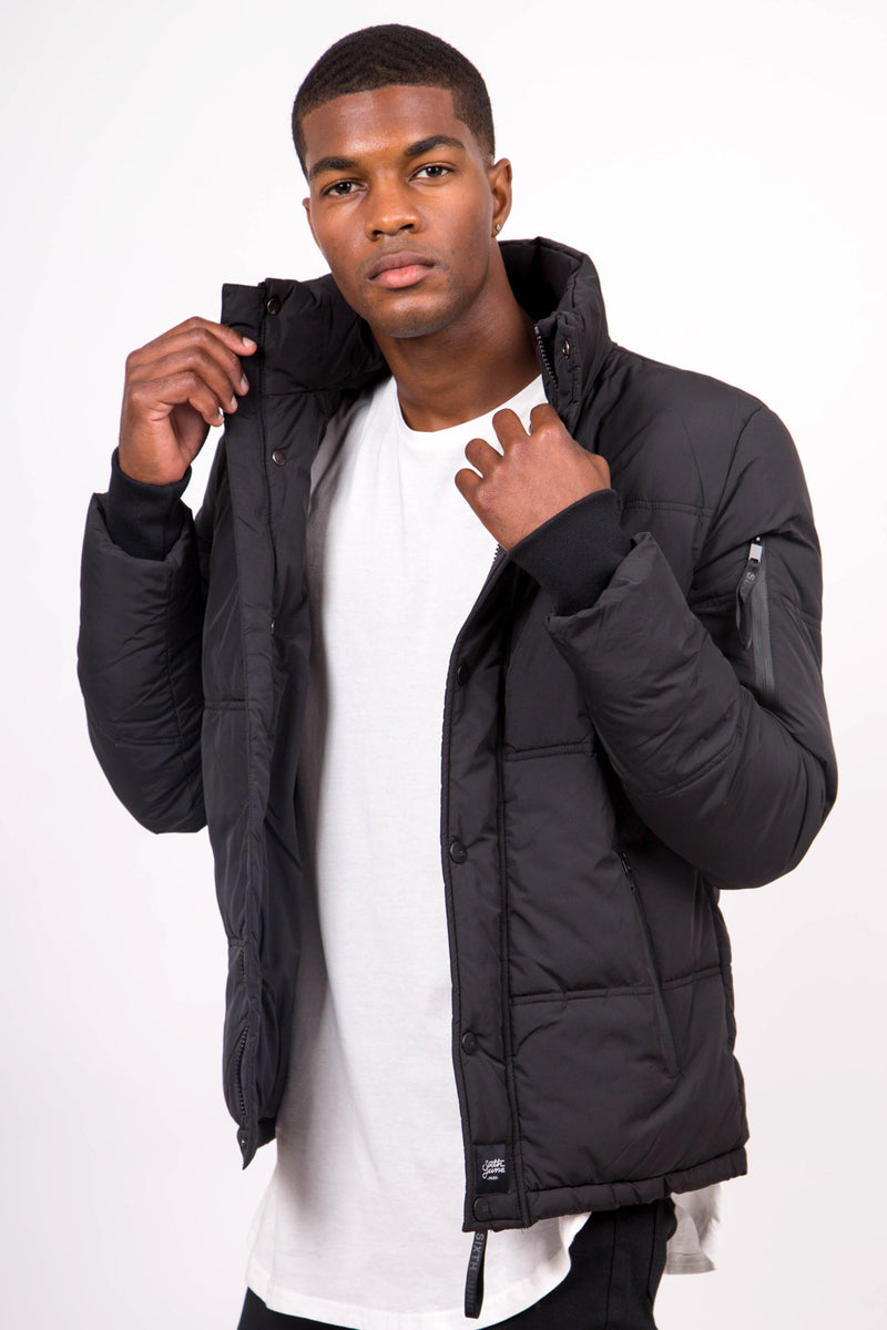 Doudoune courte Sixth June pour homme. Coupe classique, bords-côtes au niveau des manches, poche intérieure, poche sur le bras gauche, fermeture zippée et boutonnée et col montant. Modèle noir.