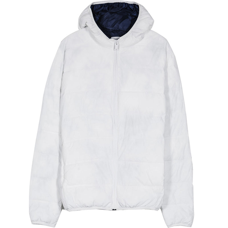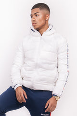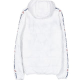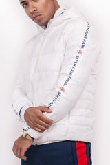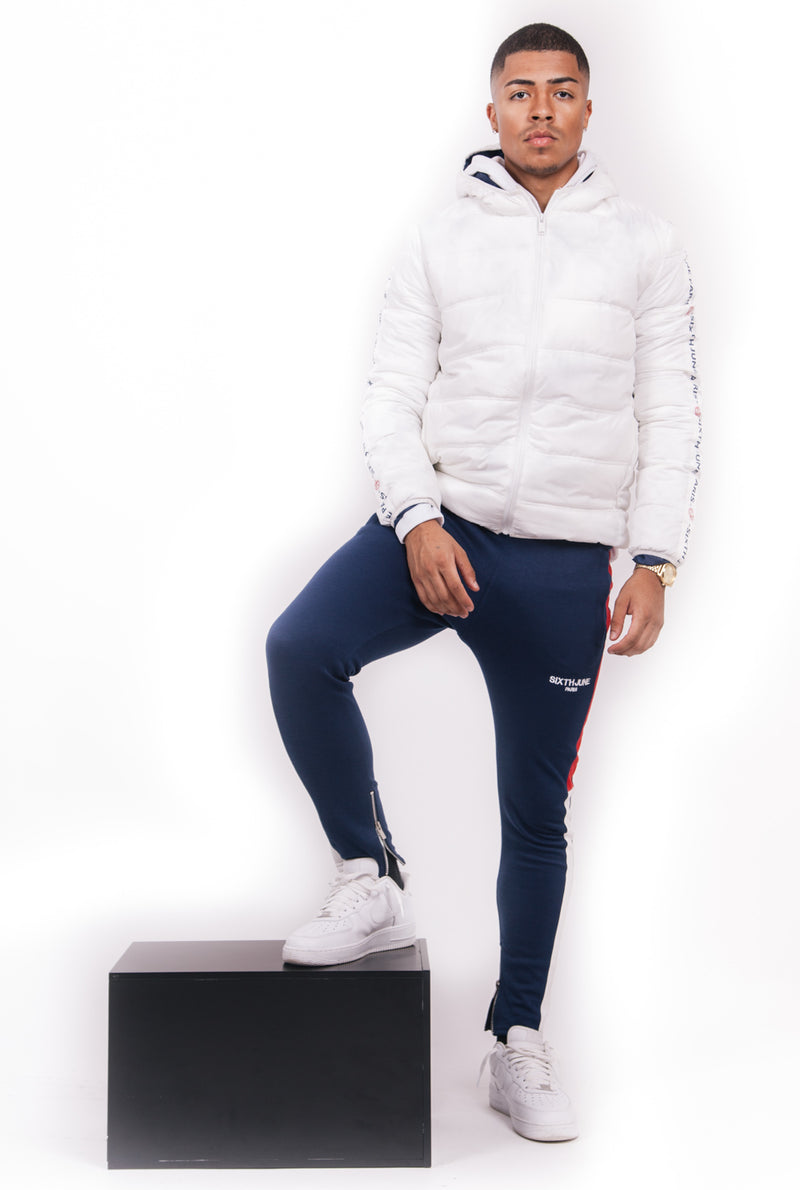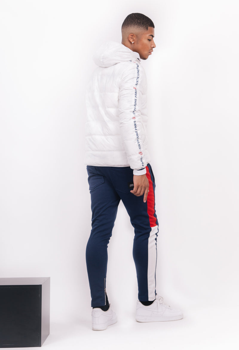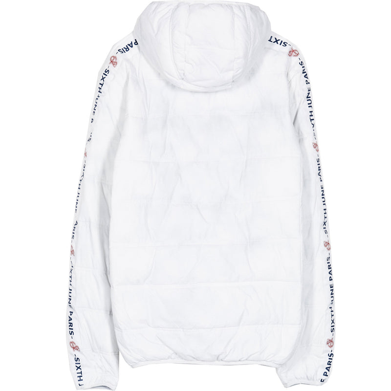 Doudoune homme Sixth June avec des bandes imprimées "Sixth June Paris" le long des manches. Coupe classique, matière fine et légère, capuche intégrée et poches latérales zippées. Modèle blanc avec doublure bleue.