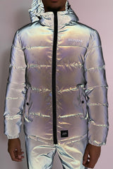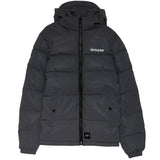 Doudoune pour homme de marque Sixth June. Entièrement réfléchissante, effet brillant à la lumière avec capuche intégrée. Poches latérales poche intérieure, imprimé Sixth June à l'avant, fermeture zippée. Coupe classique. Modèle noir, aspect gris très foncé.