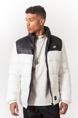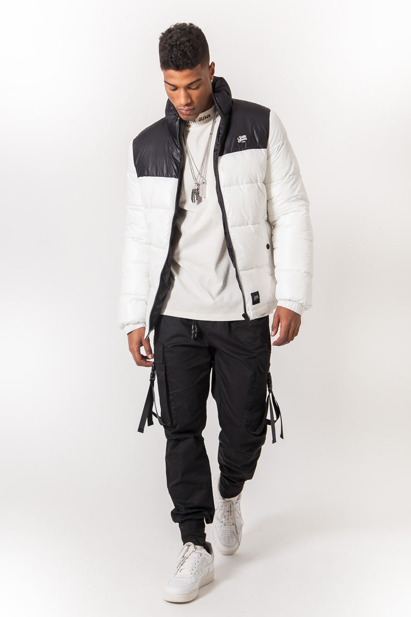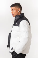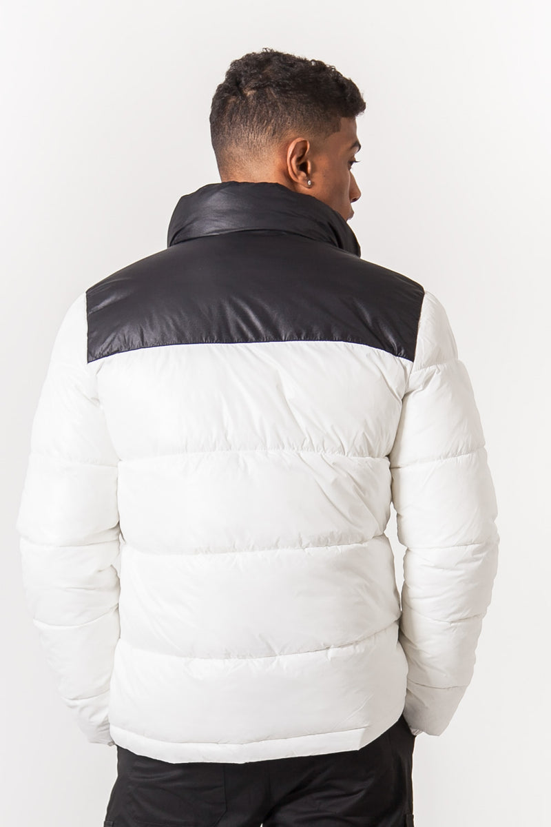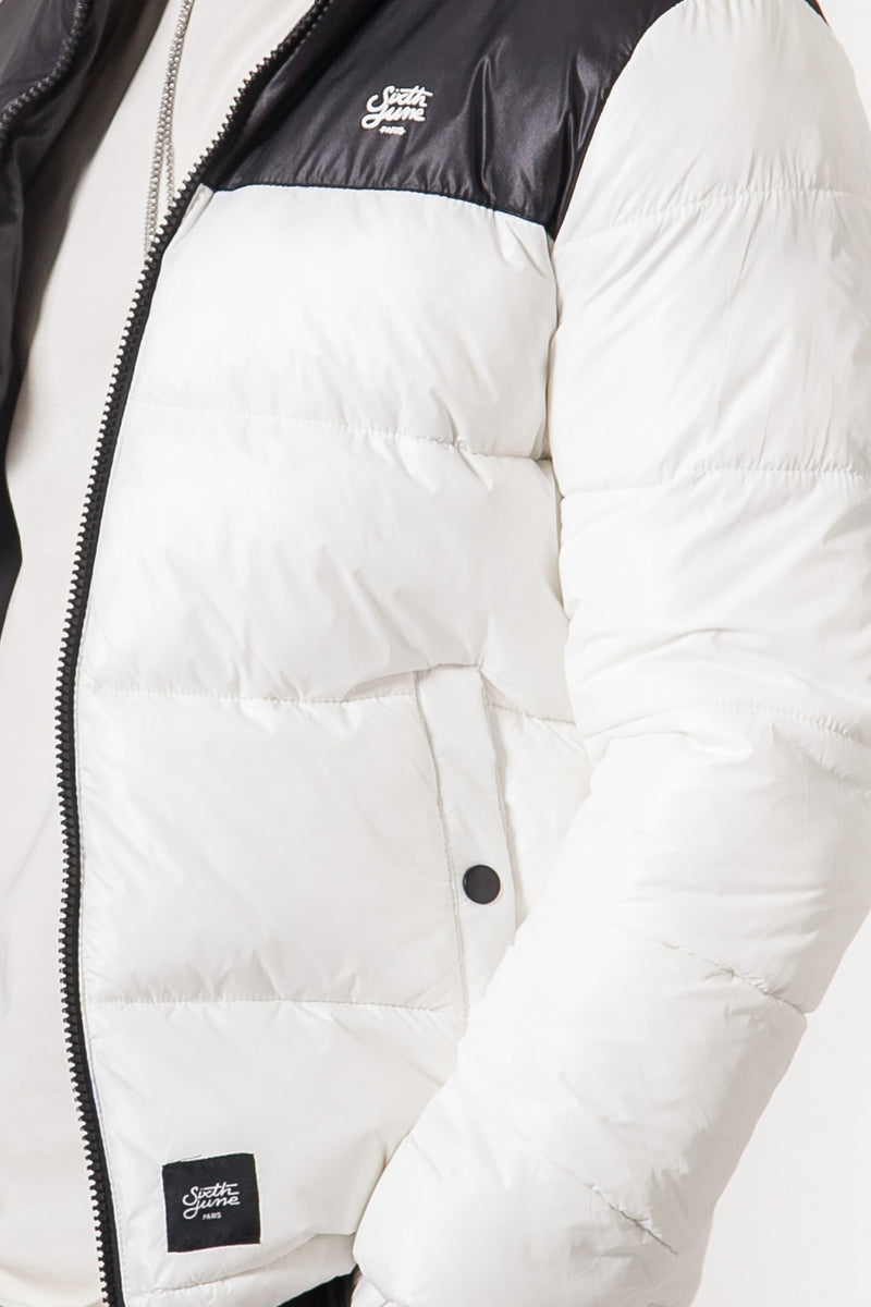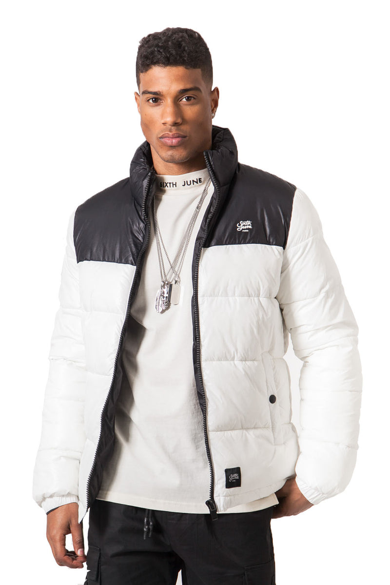 Doudoune pour homme de marque Sixth June. Matière aspect vinyle, effet brillant. Bicolore au niveau du col (avant et arrière). Poches latérales, poche intérieure, fermeture zippée, bords côtes aux poignets. Coupe ajustée. Modèle blanc et noir.