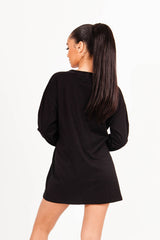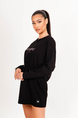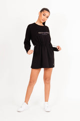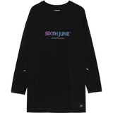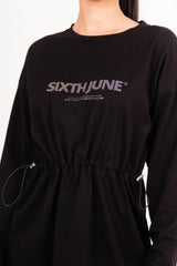 Robe à manches longues pour femme de marque Sixth June. Cordons de serrage à la taille pour un effet ajustée au niveau de la taille. Imprimé réfléchissant SIXTH JUNE à l'avant sur la poitrine. Col rond. Coupe classique , longueur mini. Modèle noir.