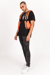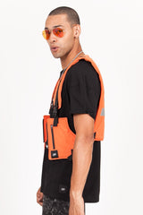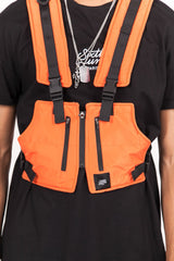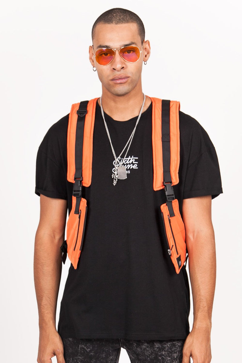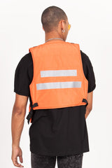 Gilet tactique Sixth June homme et femme. Coupe classique courte, fermeture zippée à l'avant, fermeture à clip à l'avant et sur les côtés, lanières ajustables et bandes refléchissantes dans le dos. Modèle orange et noir.
