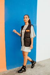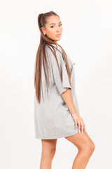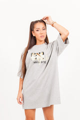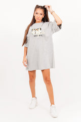 Robe à manches courtes pour femme de marque de Sixth June. Imprimé muses avec texte à l'avant. Col rond et côtelé. Coupe classique, épaules tombantes, longueur mini. Modèle gris.