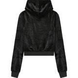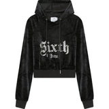 Matière très douce, effet velours, inscription Sixth June en strass et caractère gothique à l'avant. Capuche avec cordons de serrage, poignets et base côtelés.