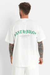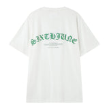 Grand logo imprimé au dos en caractère gothique, texte imprimé en-dessous.