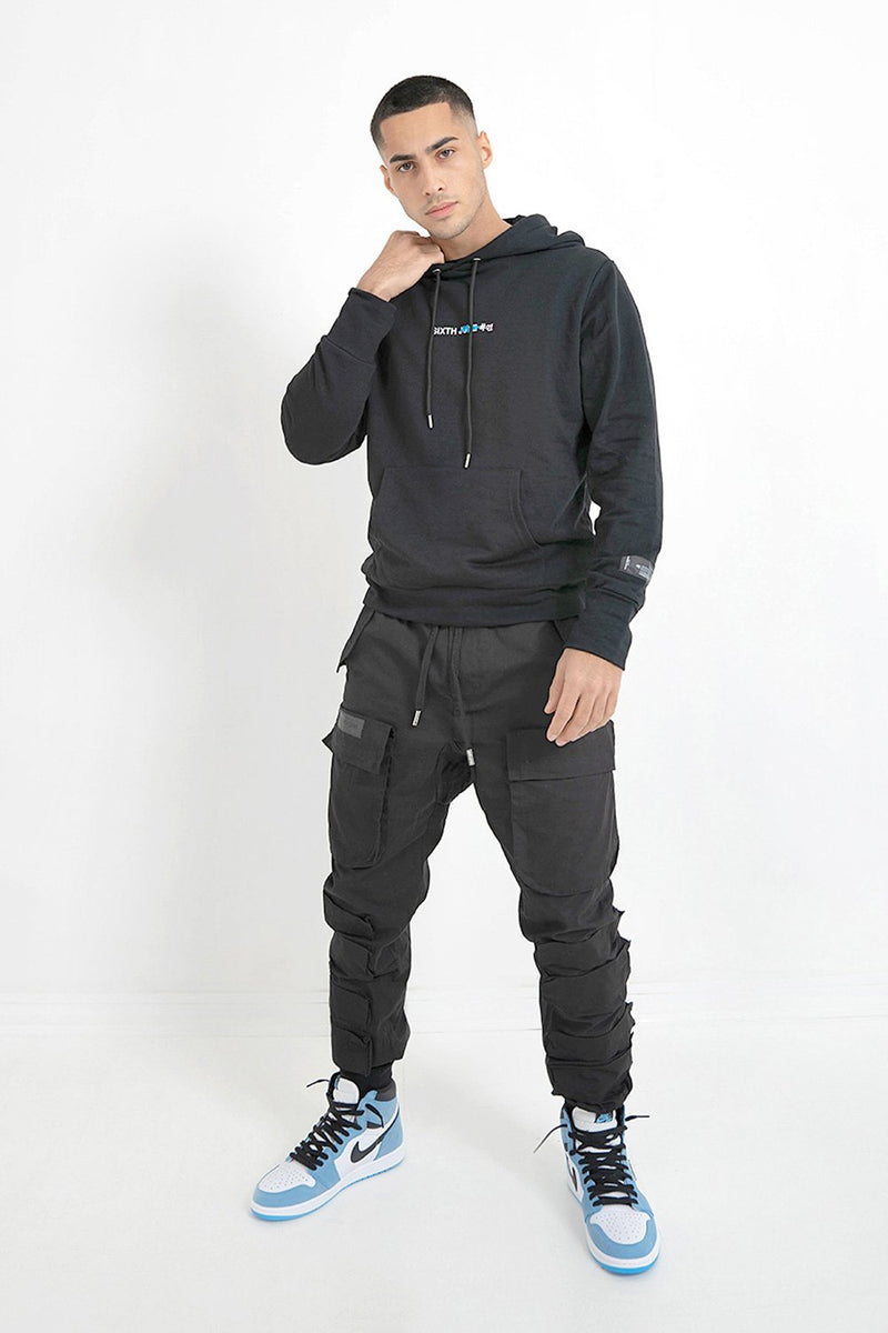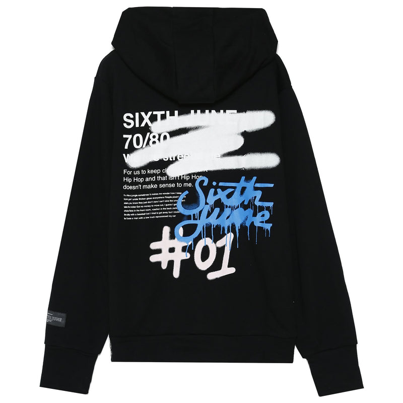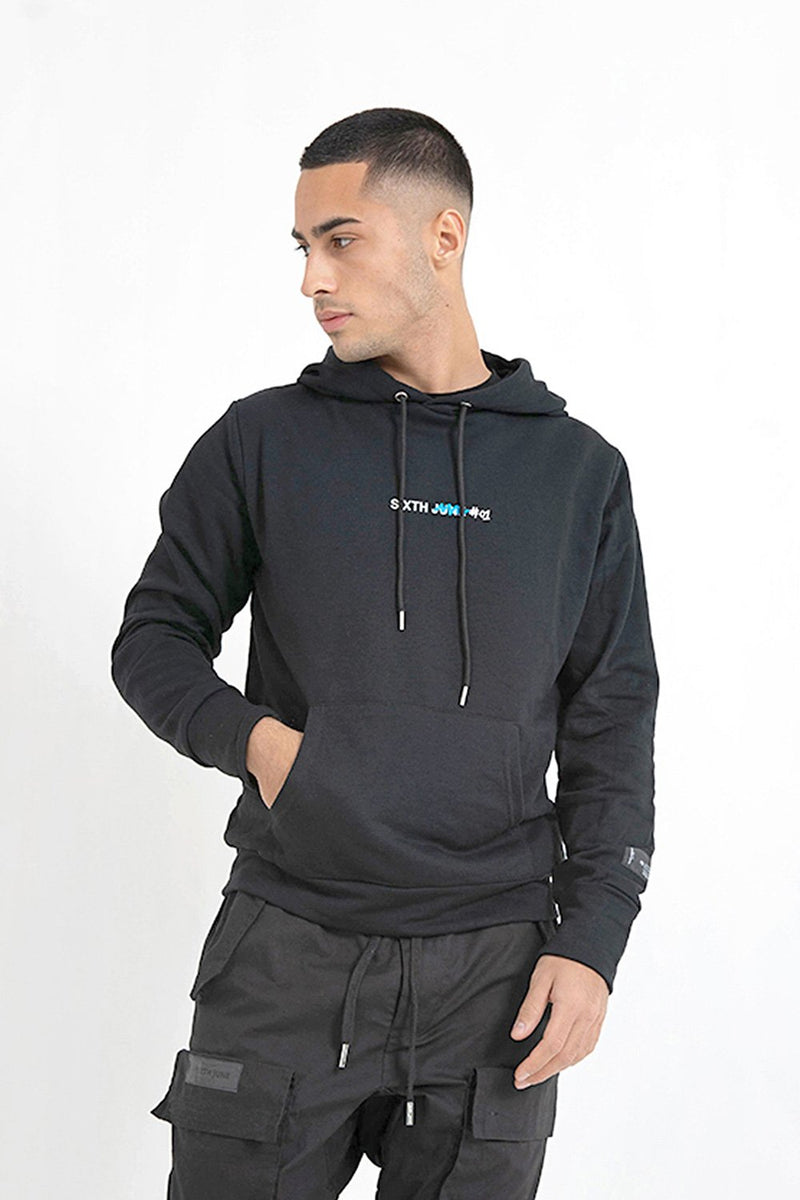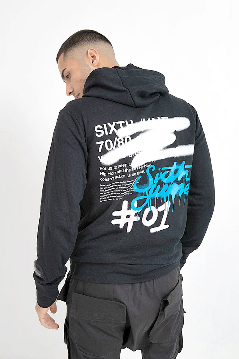 Sweatshirt pour homme de marque Sixth June. Graffiti à l'arrière avec textes, logo SIXTH JUNE, petit imprimé à l'avant. Cordon de serrage au niveau de la capuche, poche kangourou. Coupe classique. Modèle noir.