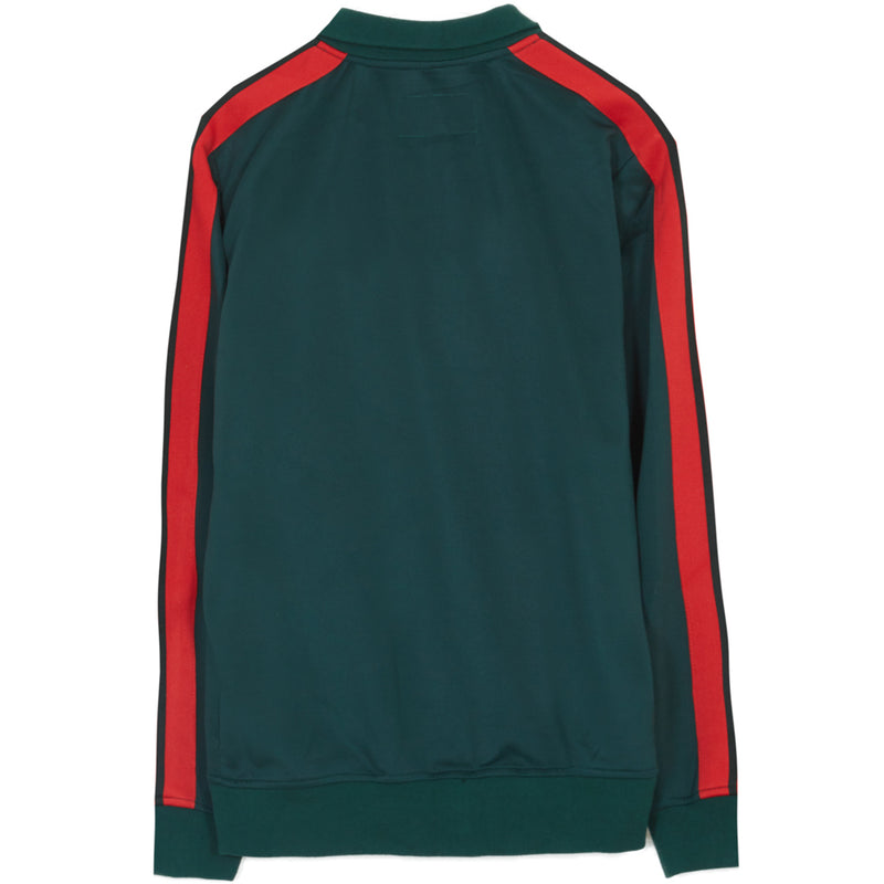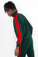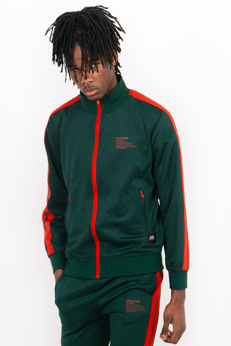 Haut de survêtement Sixth June pour homme avec double bandes le long des manches. Coupe classique, poches latérales zippées, fermeture zippée contrastante, bords côtes au niveau des poignets, de la base et du col. Petit texte imprimé sur la poitrine: "Talk to your family and friends. Call us to win +33 6 52 24 18 87, streetstyle brand since a lot of years". Modèle vert foncé et rouge.