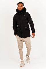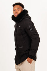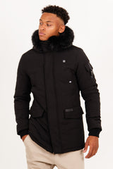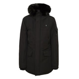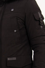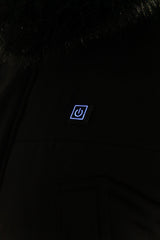 Parka pour homme de marque Sixth June. Technologie chauffante, grâce à une batterie et un tissu intelligent qui diffuse et retient la chaleur à l'intérieur de la veste. Bouton de démarrage (LED) à l’avant, batterie fournie et rechargeable sur un port USB. Tissu haute densité, rembourré et déperlant. Poches avant avec fermeture à bouton et à aimant, poche intérieure avec emplacement pour la batterie, poche avec sangle sur bras avant gauche. Fermeture centrale à zip et aimantée. Capuche ajustable (non amovible) avec fourrure amovible, bords-côtes aux poignets. Coupe ajustée. Modèle noir.