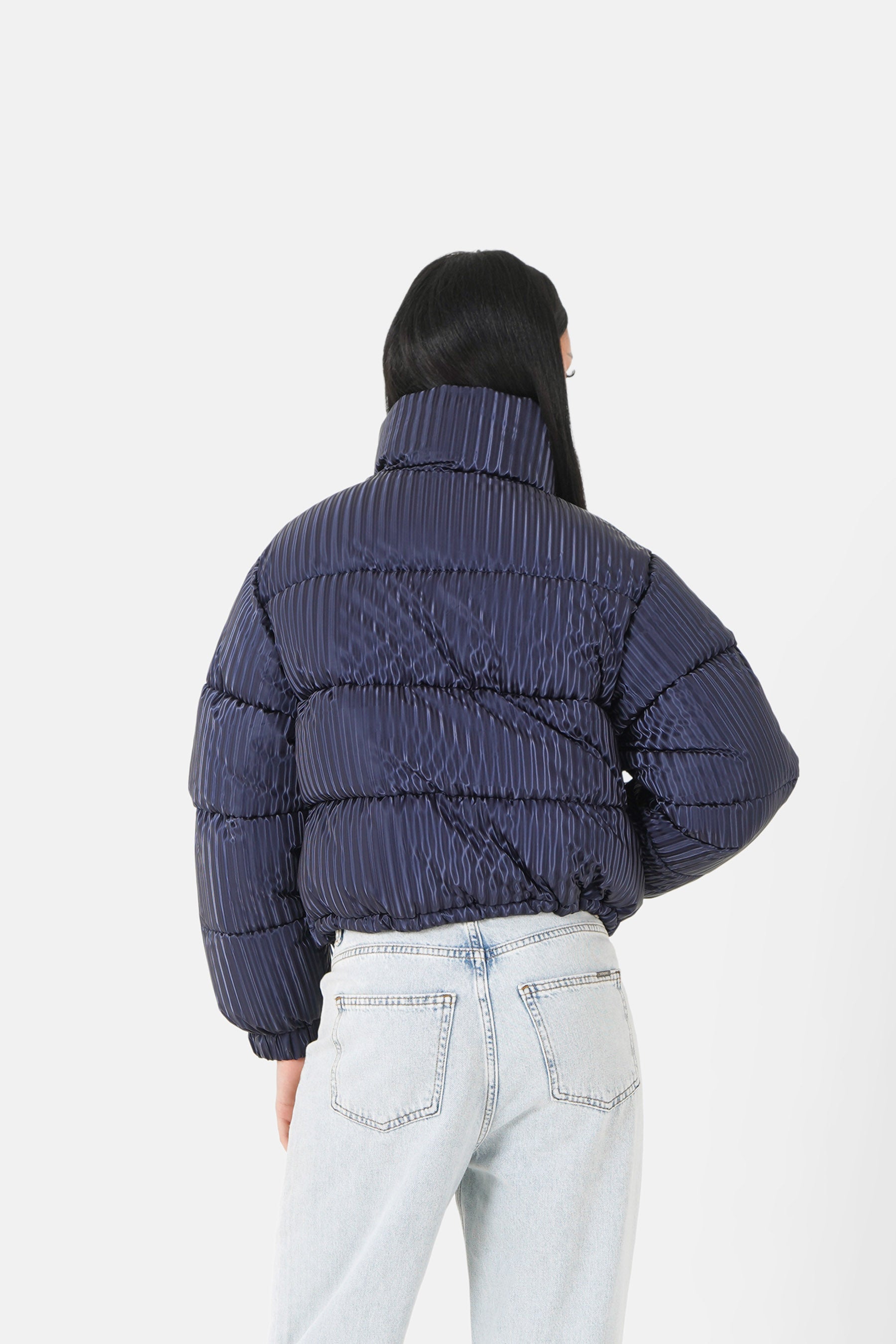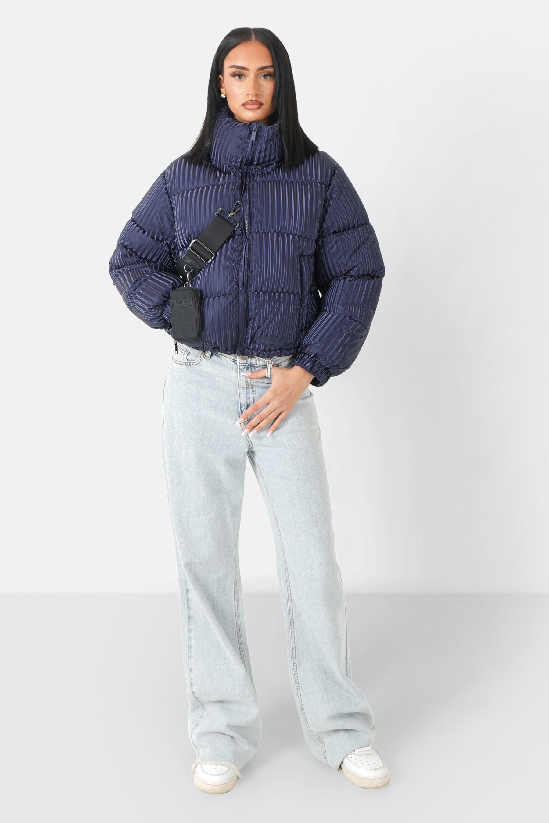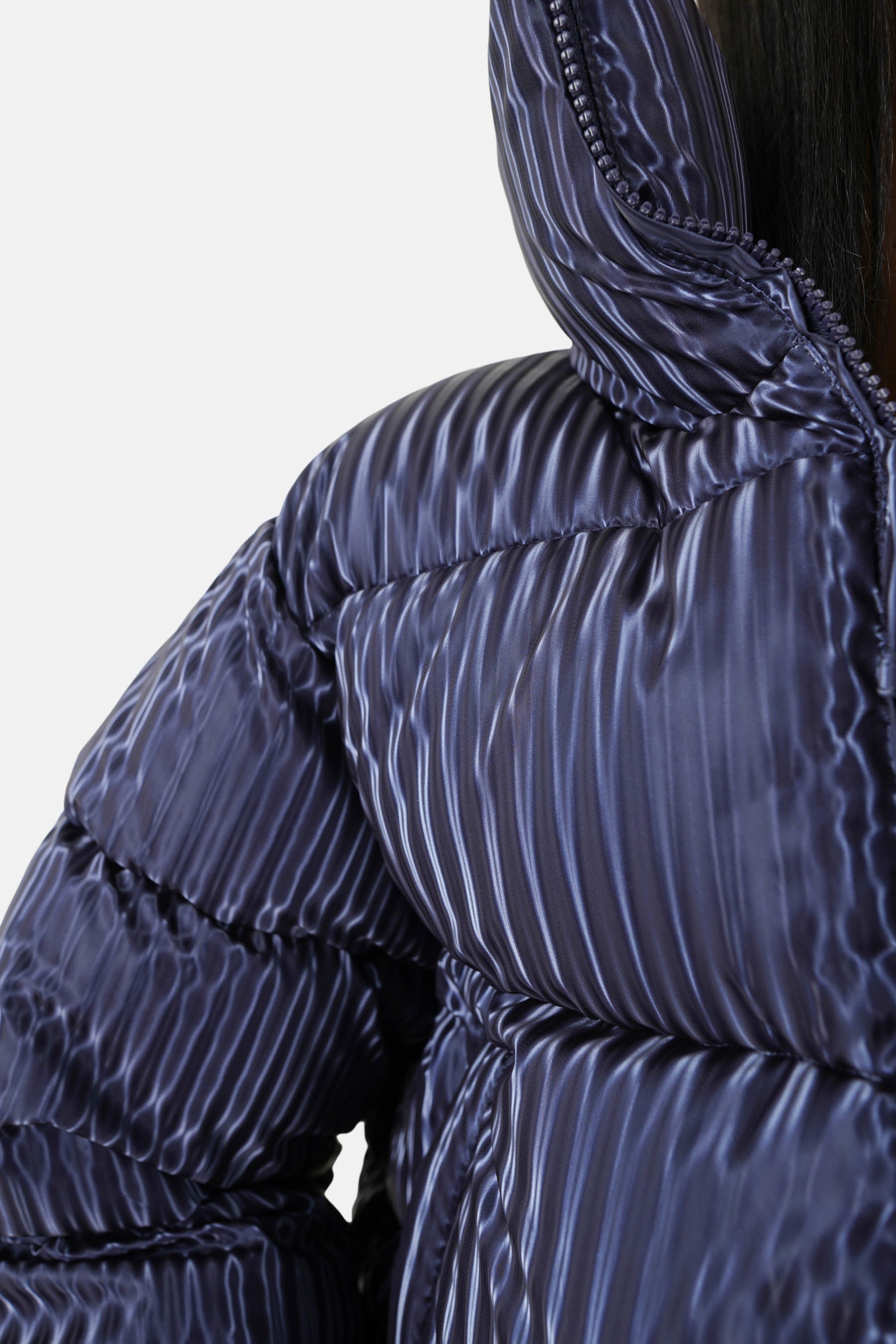 Matière effet brillant à la lumière, tissu matelassé ondulé, logo en relief sur patch en gomme près de la base.