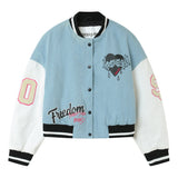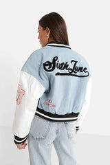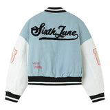 Imprimés (coeur et Freedom) et broderies Sixth June à l'avant, logo brodé au dos avec tissu effet éponge, manches dépareillées avec empiècements brodés également en tissu effet éponge.