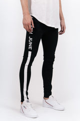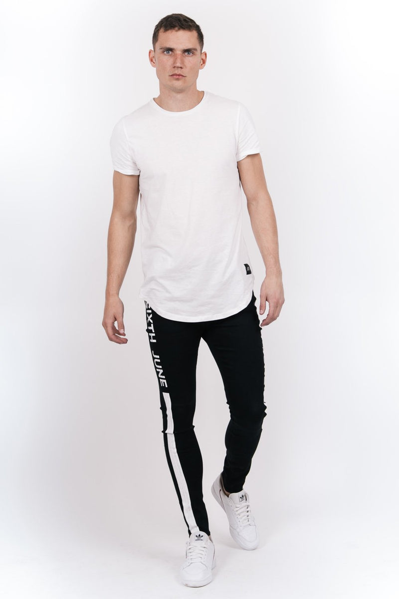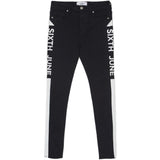 Jean pour homme de marque Sixth June. Bandes imprimés Sixth June avec un effet délavé et usé le long des jambes. Fermeture boutonnée, poches à l'avant et l'arrière. Coupe skinny (près du corps). Modèle noir avec bandes blanches.