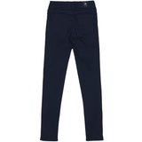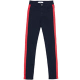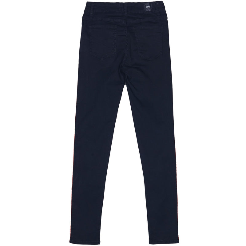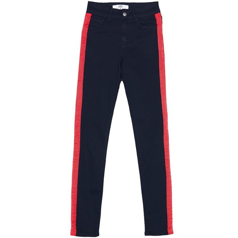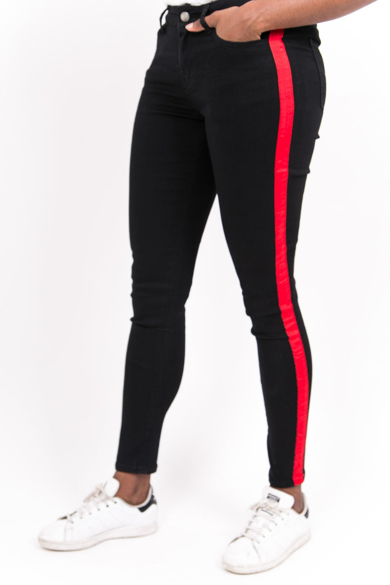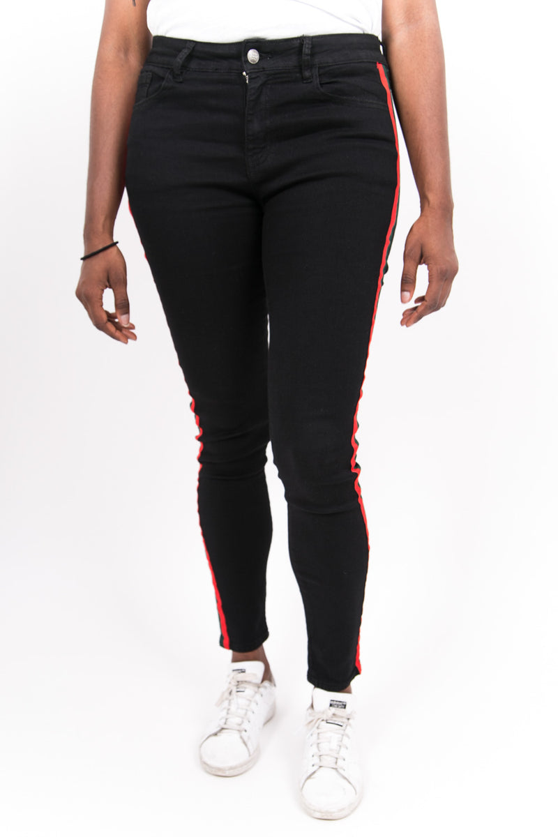 Jean femme Sixth June avec des bandes le long des jambes. Coupe skinny, poches latérales et arrières. Modèle noir avec bandes rouges.