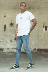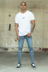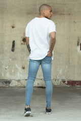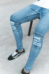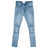 Jean homme Sixth June avec une couture et déchirure au niveau des genoux. Délavage, coupe skinny très près du corps. Modèle bleu moyen.