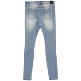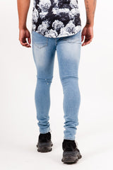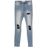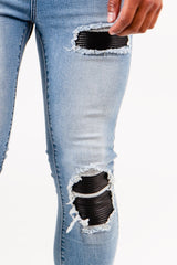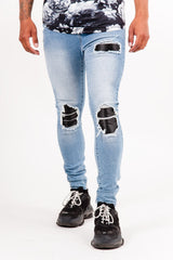 Jean pour homme de marque Sixth June. Effet déchiré sur les genoux et la cuisse. Empiècements en simili cuir gaufrés. Coupe slim. Modèle bleu.