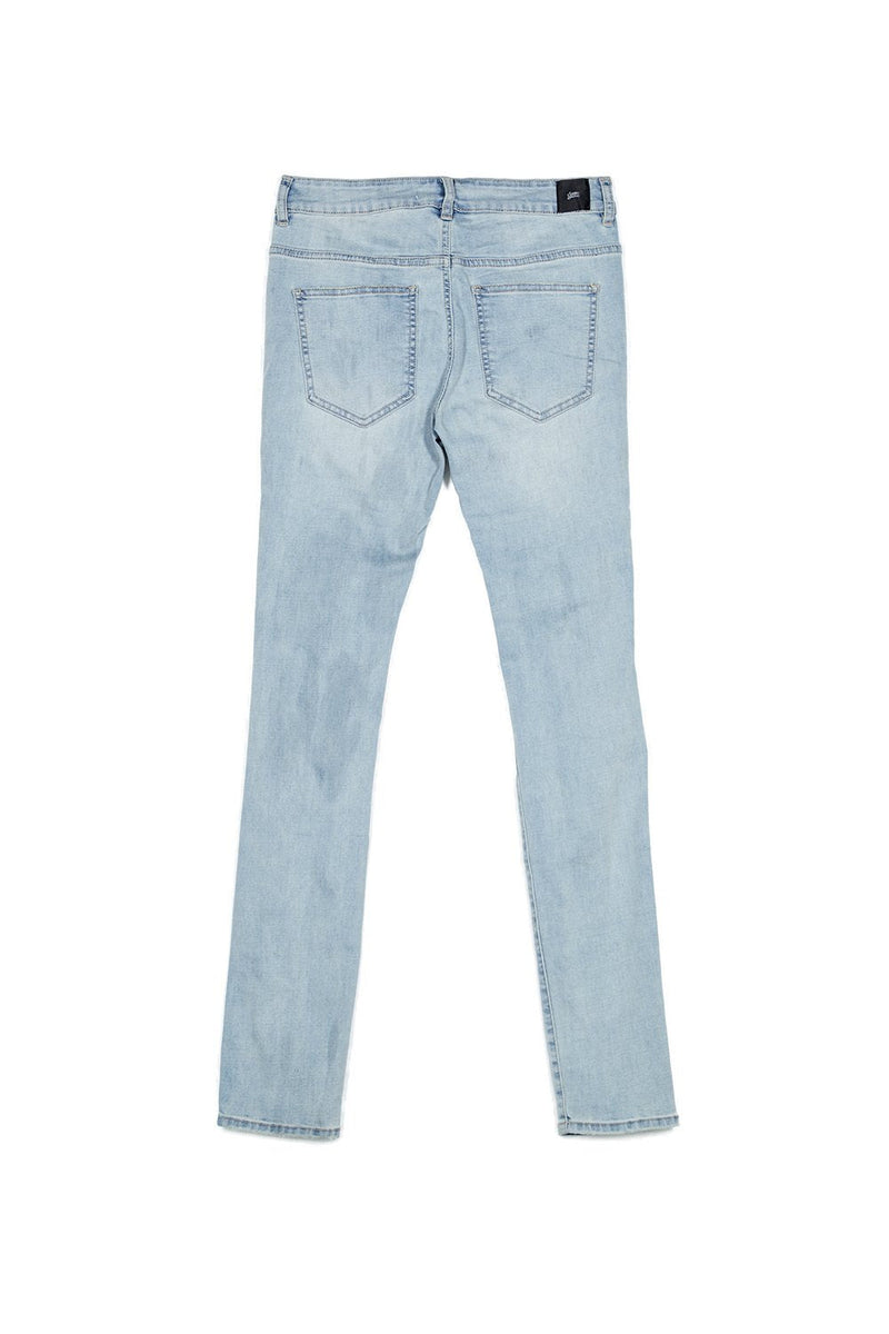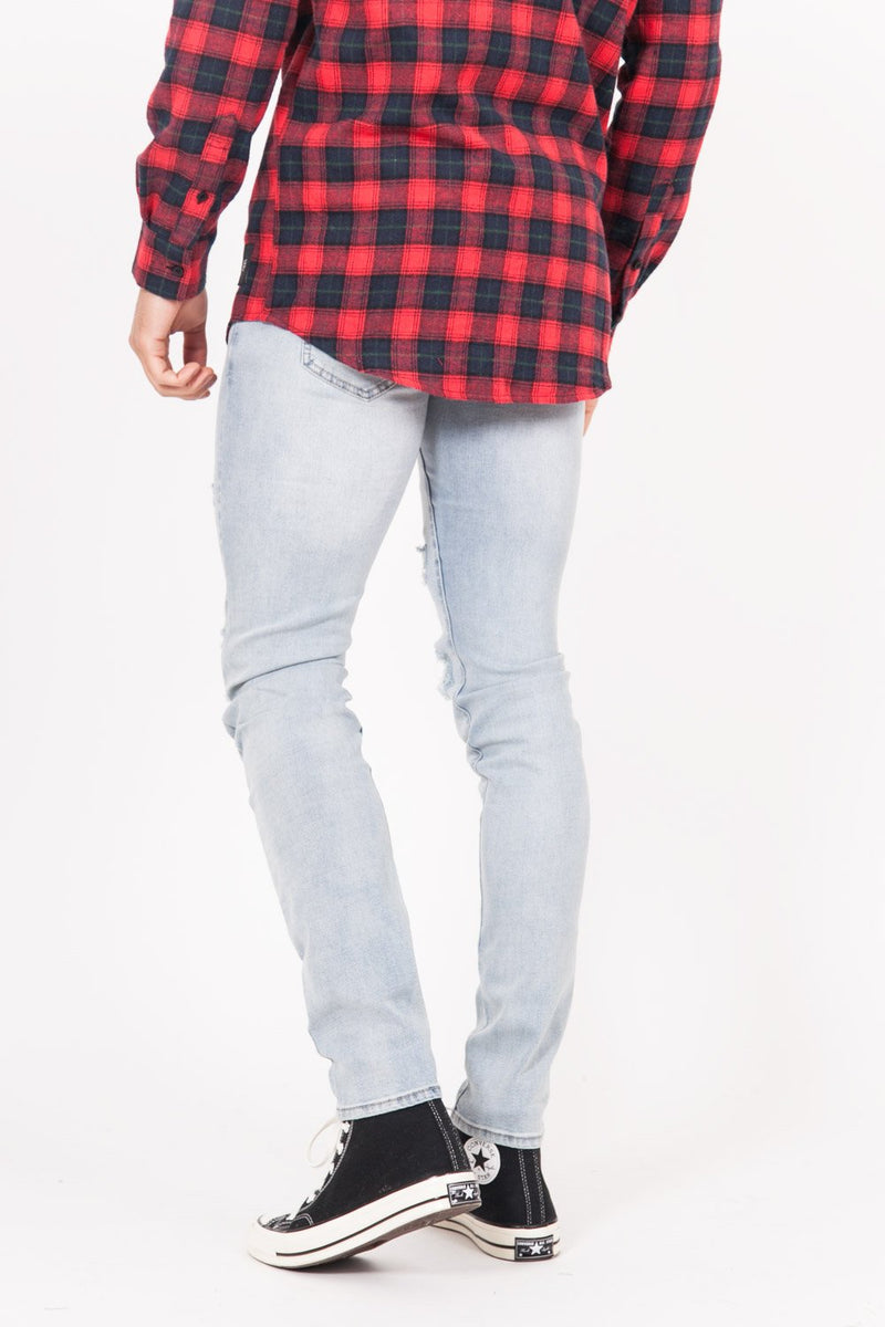 Jean homme Sixth June avec des déchirures et un empiècement à l'intérieur (camouflage vert, bandana rouge, fleur bleu). Coupe skinny très près du corps. Modèle bleu clair.