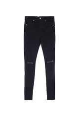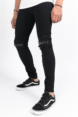 Jean homme Sixth June avec des déchirures au niveau des genoux et des empiècements cloutés effet punk. Coupe skinny très près du corps. Modèle noir.