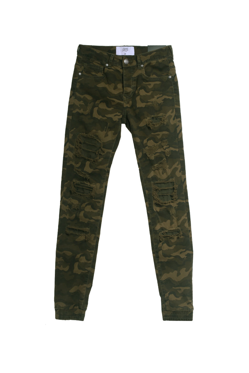Jean camouflage Sixth June Homme. Effet destroy à l'avant. Bas resséré avec elastique. Coupe slim.