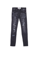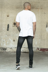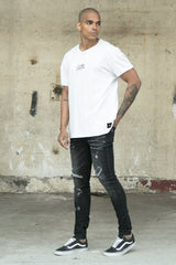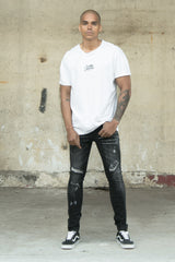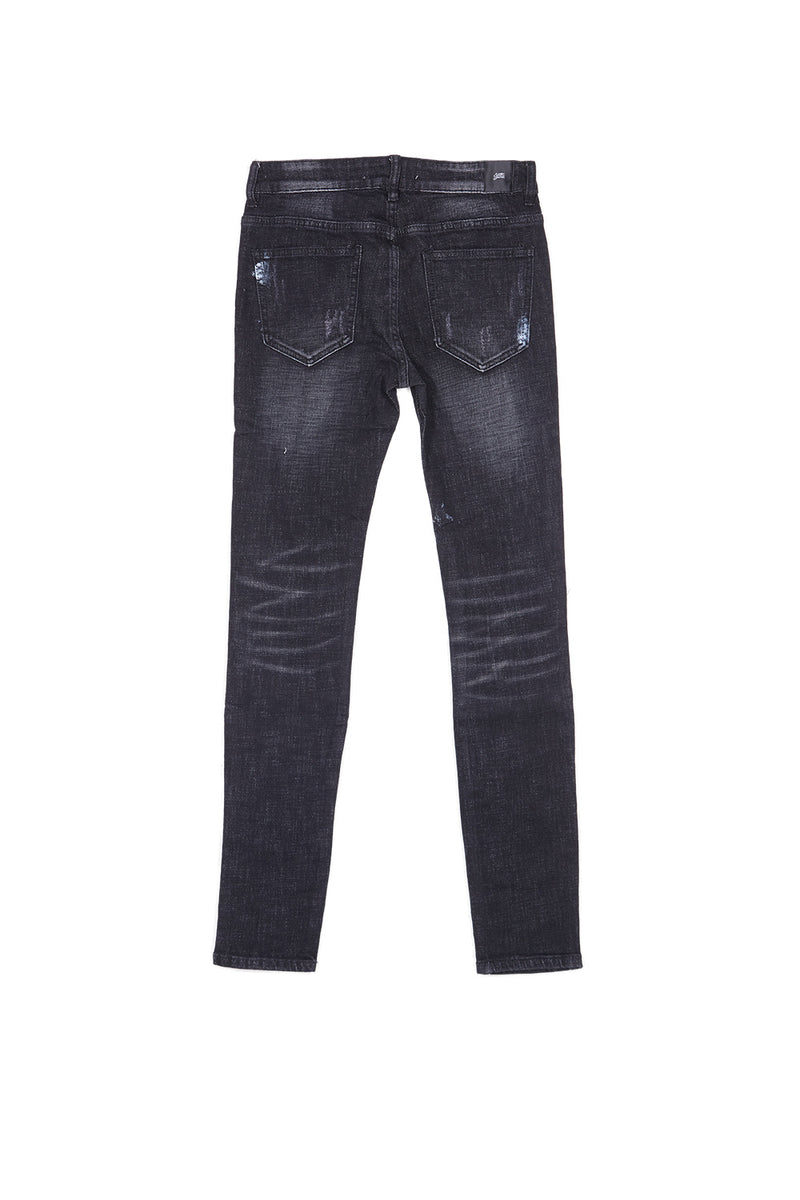Jean homme Sixth June avec des effets peinture à l'avant, et un délavage. Petites déchirures, et coupe skinny très près du corps. Modèle noir gris.