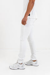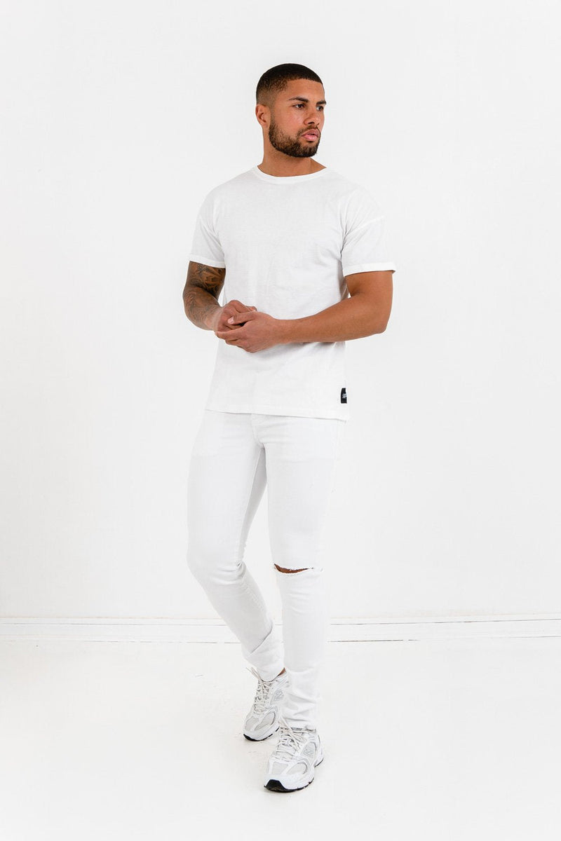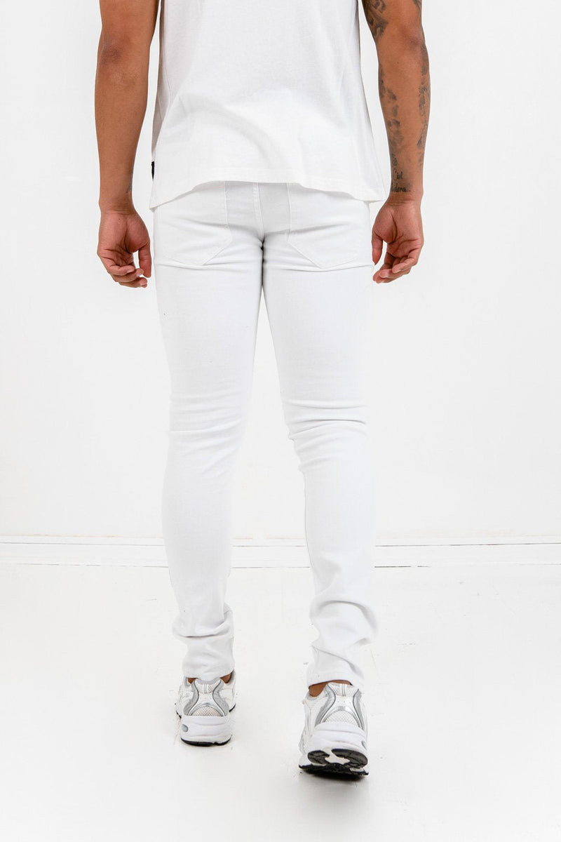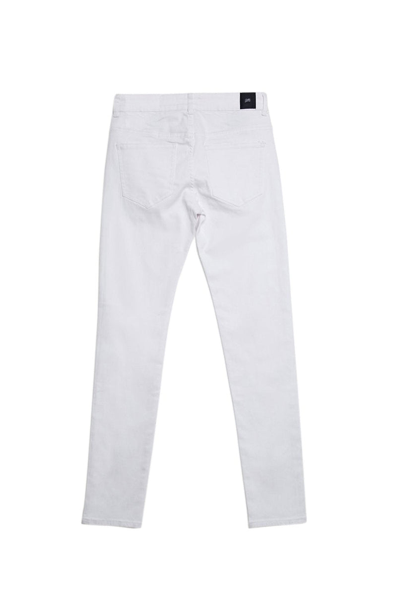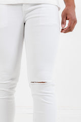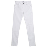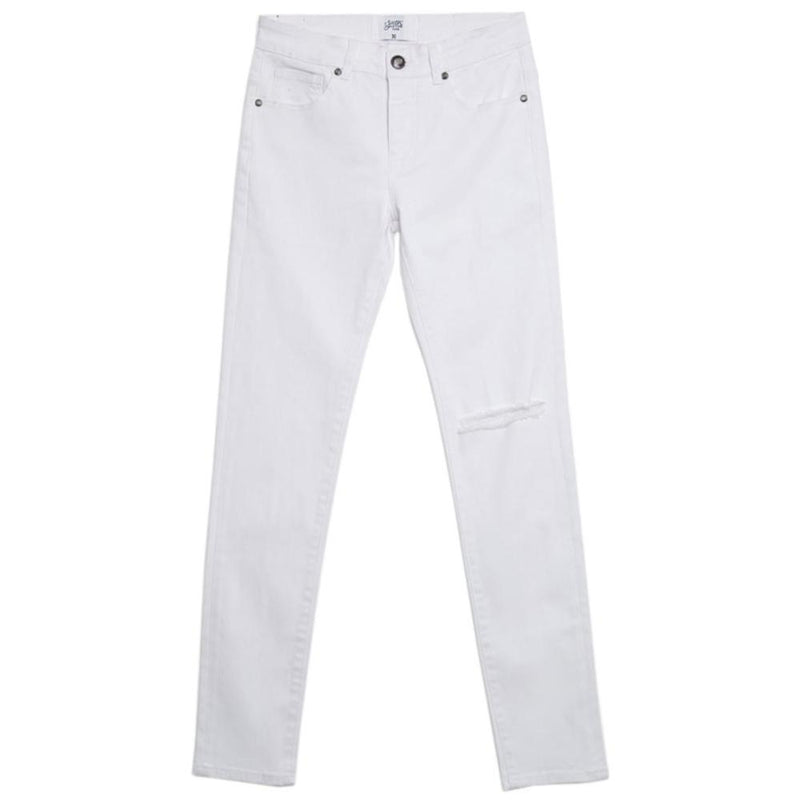 Déchirure au niveau du genou sur la jambe gauche. Poches à l'avant et l'arrière, fermeture à boutons.