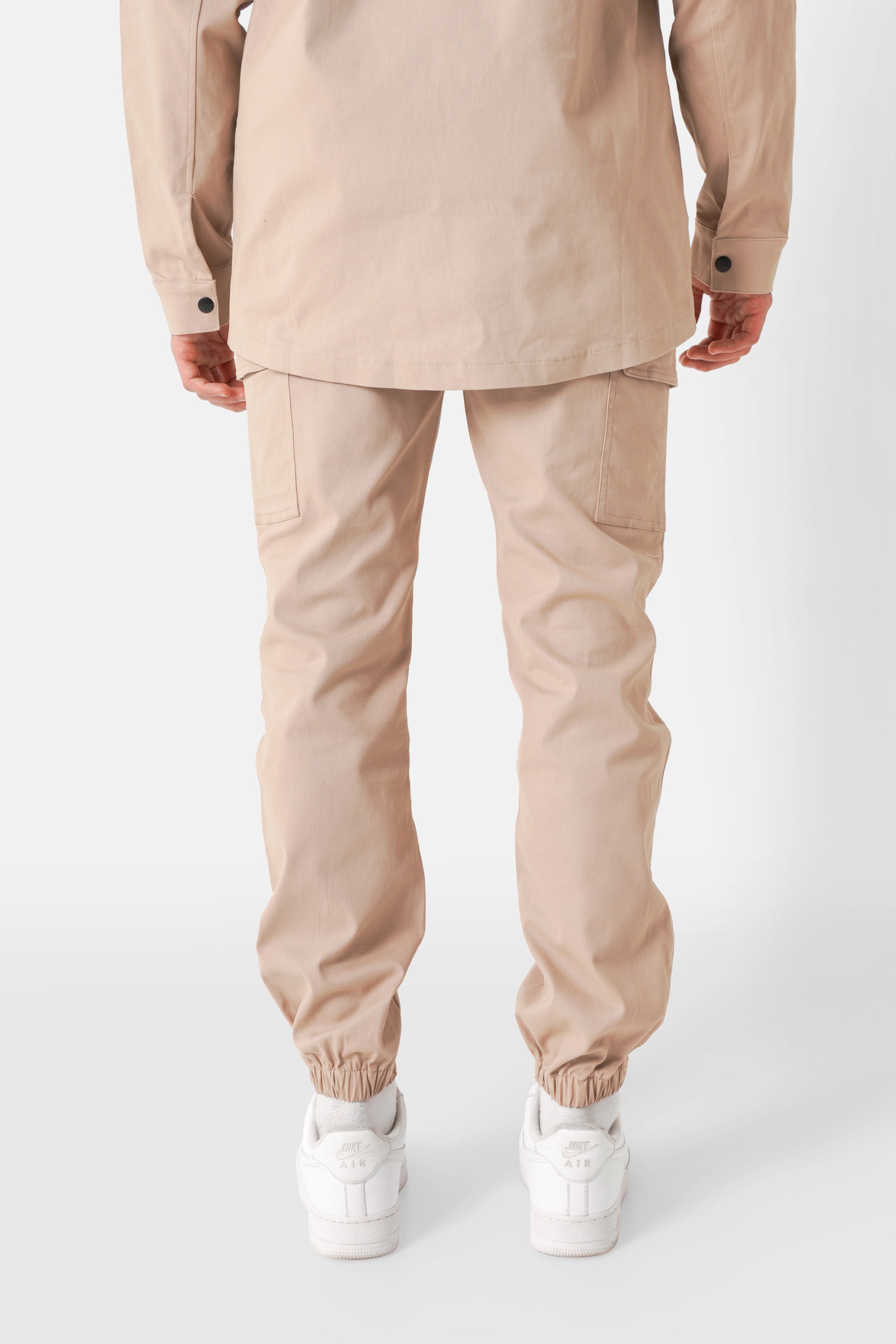Poches latérales, taille élastique avec cordon de serrage, élastiques aux chevilles, poches arrières plaquées.
