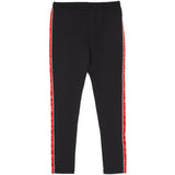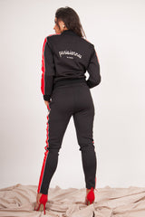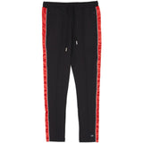 Pantalon de jogging Sixth June pour femme avec des bandes satinées le long des jambes. Coupe classique, taille élastique avec cordons de serrage et poches latérales zippées. Modèle noir avec bandes rouges.