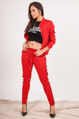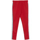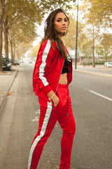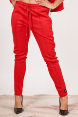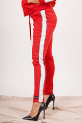 Pantalon de jogging Sixth June pour femme avec des bandes satinées le long des jambes. Coupe classique, taille élastique avec cordons de serrage et poches latérales zippées. Modèle rouge avec bandes blanches.