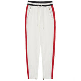 Jogging Sixth June pour homme avec des bandes le long des jambes. Coupe classique, élastique bicolore à la taille avec cordons de serrage, poches latérales avec fermetures zippées, poches arrières, détails surpiqués le long des jambes et zips intérieurs aux chevilles. Modèle blanc avec bandes rouges.