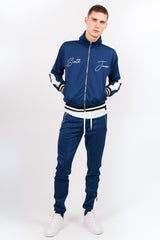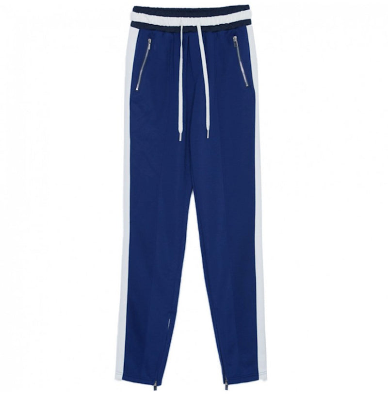 Jogging Sixth June pour homme avec des bandes le long des jambes. Coupe classique, élastique bicolore à la taille avec cordons de serrage, poches latérales avec fermetures zippées, poches arrières, détails surpiqués le long des jambes et zips intérieurs aux chevilles. Modèle bleu marine avec bandes blanches.